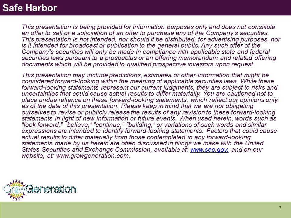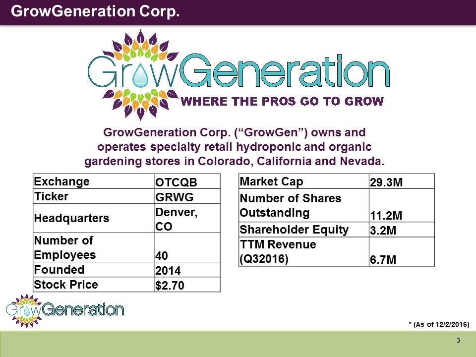 2 Safe Harbor This presentation is being provided for information purposes only and does not constitute an offer to sell or a solicitation of an offer to purchase any of the Company’s securities. This presentation is not intended, nor should it be distributed, for advertising purposes, nor is it intended for broadcast or publication to the general public. Any such offer of the Company’s securities will only be made in compliance with applicable state and federal securities laws pursuant to a prospectus or an offering memorandum and related offering documents which will be provided to qualified prospective investors upon request. This presentation may include predictions, estimates or other information that might be considered forward - looking within the meaning of applicable securities laws. While these forward - looking statements represent our current judgments, they are subject to risks and uncertainties that could cause actual results to differ materially. You are cautioned not to place undue reliance on these forward - looking statements, which reflect our opinions only as of the date of this presentation. Please keep in mind that we are not obligating ourselves to revise or publicly release the results of any revision to these forward - looking statements in light of new information or future events. When used herein, words such as "look forward," "believe," "continue," "building," or variations of such words and similar expressions are intended to identify forward - looking statements. Factors that could cause actual results to differ materially from those contemplated in any forward - looking statements made by us herein are often discussed in filings we make with the United States Securities and Exchange Commission, available at: www.sec.gov, and on our website, at: www.growgeneration.com.