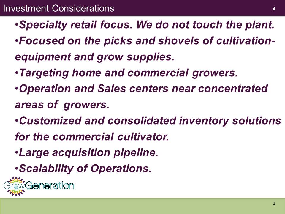 GrowGeneration Corp. Corp. 3 GrowGeneration Corp. (“GrowGen”) owns and operates specialty retail hydroponic and organic gardening stores in Colorado, California and Nevada. * (As of 12/2/2016) Exchange OTCQB Ticker GRWG Headquarters Denver, CO Number of Employees 40 Founded 2014 Stock Price $2.70 Market Cap 29.3M Number of Shares Outstanding 11.2M Shareholder Equity 3.2M TTM Revenue (Q32016) 6.7M