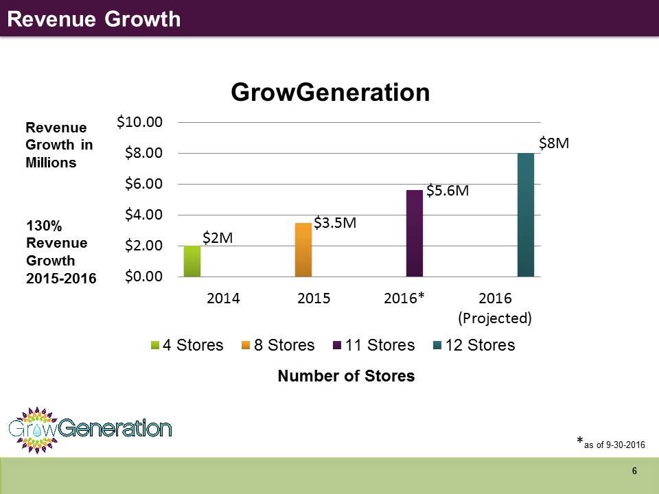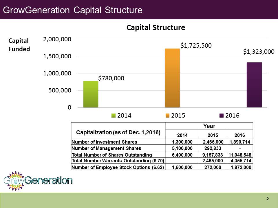0 500,000 1,000,000 1,500,000 2,000,000 Capital Structure 2014 2015 2016 Capitalization (as of Dec. 1,2016) Year 2014 2015 2016 Number of Investment Shares 1,300,000 2,465,000 1,890,714 Number of Management Shares 5,100,000 292,833 - Total Number of Shares Outstanding 6,400,000 9,157,833 11,048,548 Total Number Warrants Outstanding ($.70) 2,465,000 4,355,714 Number of Employee Stock Options ($.62) 1,600,000 272,000 1,872,000 GrowGeneration Capital Structure Capital Funded $780,000 $1,725,500 $1,323,000 5