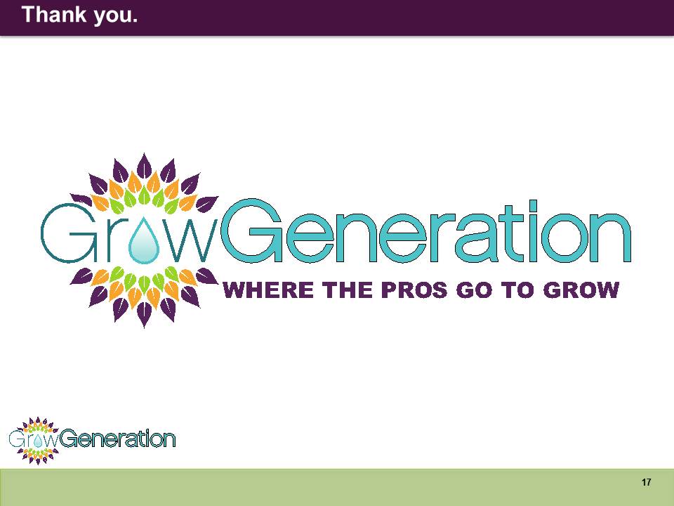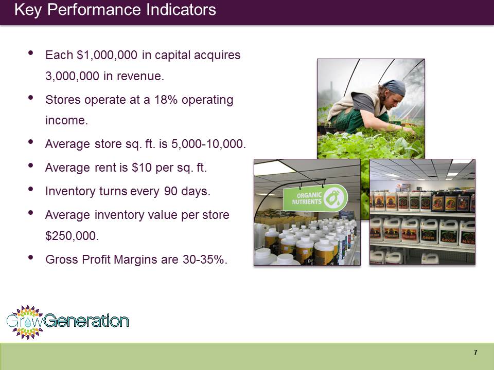 Thank you. $0.00 $2.00 $4.00 $6.00 $8.00 $10.00 2014 2015 2016* 2016 (Projected) GrowGeneration 4 Stores 8 Stores 11 Stores 12 Stores Number of Stores Revenue Growth in Millions $2M $3.5M $5.6M $8M Revenue Growth 6 * as of 9 - 30 - 2016 130% Revenue Growth 2015 - 2016