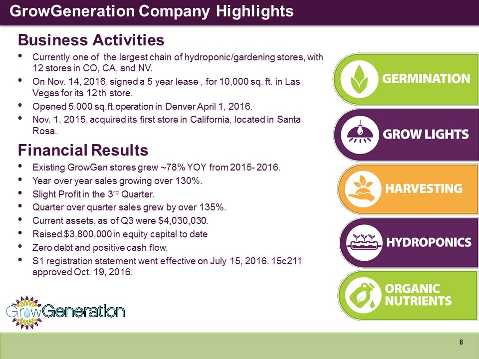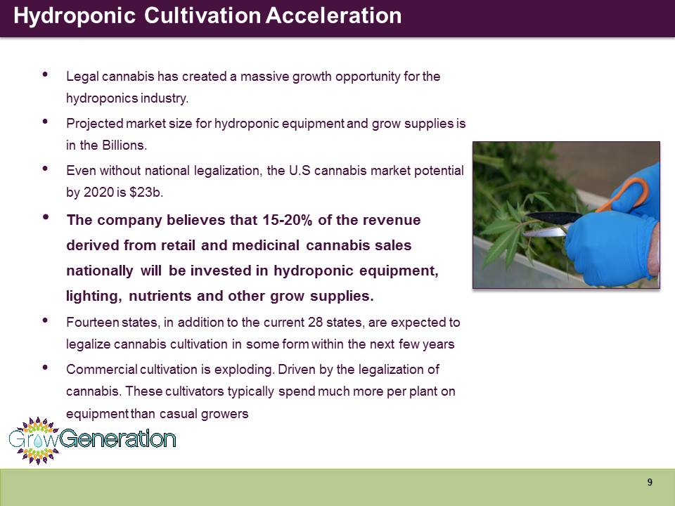 GrowGeneration Company Highlights 8 Business Activities • Currently one of the largest chain of hydroponic/gardening stores, with 12 stores in CO, CA, and NV. • On Nov. 14, 2016, signed a 5 year lease , for 10,000 sq. ft. in Las Vegas for its 12 th store. • Opened 5,000 sq.ft.operation in Denver April 1, 2016. • Nov. 1, 2015, acquired its first store in California, located in Santa Rosa. Financial Results • Existing GrowGen stores grew ~78% YOY from 2015 - 2016. • Year over year sales growing over 130%. • Slight Profit in the 3 rd Quarter. • Quarter over quarter sales grew by over 135%. • Current assets, as of Q3 were $4,030,030. • Raised $3,800,000 in equity capital to date • Zero debt and positive cash flow. • S1 registration statement went effective on July 15, 2016. 15c211 approved Oct. 19, 2016.
