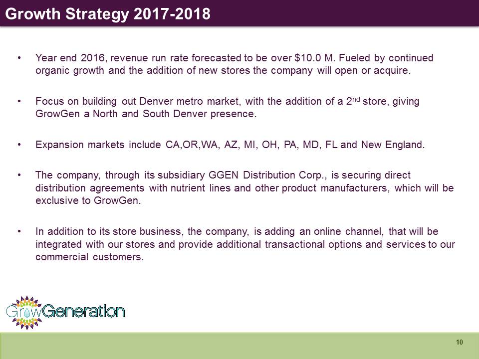 Hydroponic Cultivation Acceleration • Legal cannabis has created a massive growth opportunity for the hydroponics industry. • Projected market size for hydroponic equipment and grow supplies is in the Billions. • Even without national legalization, the U.S cannabis market potential by 2020 is $23b. • The company believes that 15 - 20% of the revenue derived from retail and medicinal cannabis sales nationally will be invested in hydroponic equipment, lighting, nutrients and other grow supplies. • Fourteen states, in addition to the current 28 states, are expected to legalize cannabis cultivation in some form within the next few years • Commercial cultivation is exploding. Driven by the legalization of cannabis. These cultivators typically spend much more per plant on equipment than casual growers 9