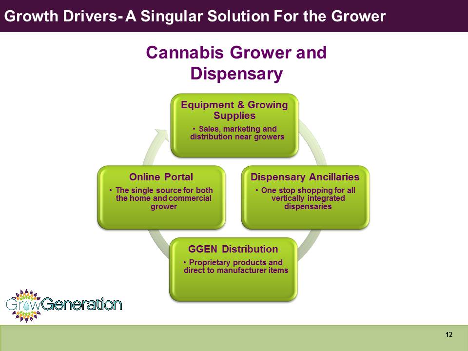 National Expansion revised Alabama Arizona Arkansas California Colorado Florida Georgia Idaho Illinois Indiana Iowa Kansas Kentucky Louisiana Maine Massachusetts Michigan Minnesota Mississippi Missouri Montana Nebraska Nevada New Hampshire New Mexico New York North Carolina North Dakota Ohio Oklahoma Oregon Pennsylvania South Carolina South Dakota Tennessee Texas Utah Vermont Virginia Washington W.Va Wisconsin Wyoming Connecticut Delaware Maryland New Jersey Rhode Island - States that GrowGeneration is currently in - Expansion States GrowGeneration Market Penetration Alaska Hawaii 11 • GrowGen operates 12 stores, across 3 states • 2017 - 2018 expansion in CO, CA, WA, AZ, OR, MI, OH, NY, FL, PA, MA, RI, MD, NH, VT • Growth fueled by both new store openings and acquisitions
