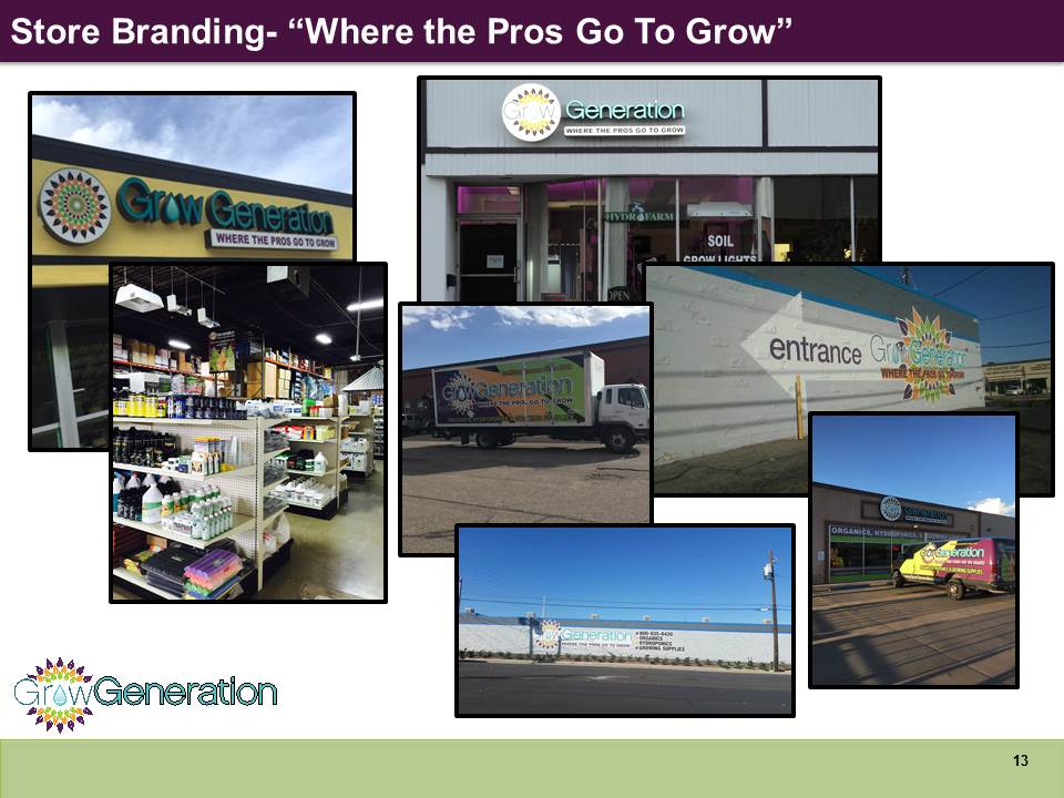 Growth Drivers - A Singular Solution For the Grower 12 Equipment & Growing Supplies • Sales, marketing and distribution near growers Dispensary Ancillaries • One stop shopping for all vertically integrated dispensaries GGEN Distribution • Proprietary products and direct to manufacturer items Online Portal • The single source for both the home and commercial grower Cannabis Grower and Dispensary