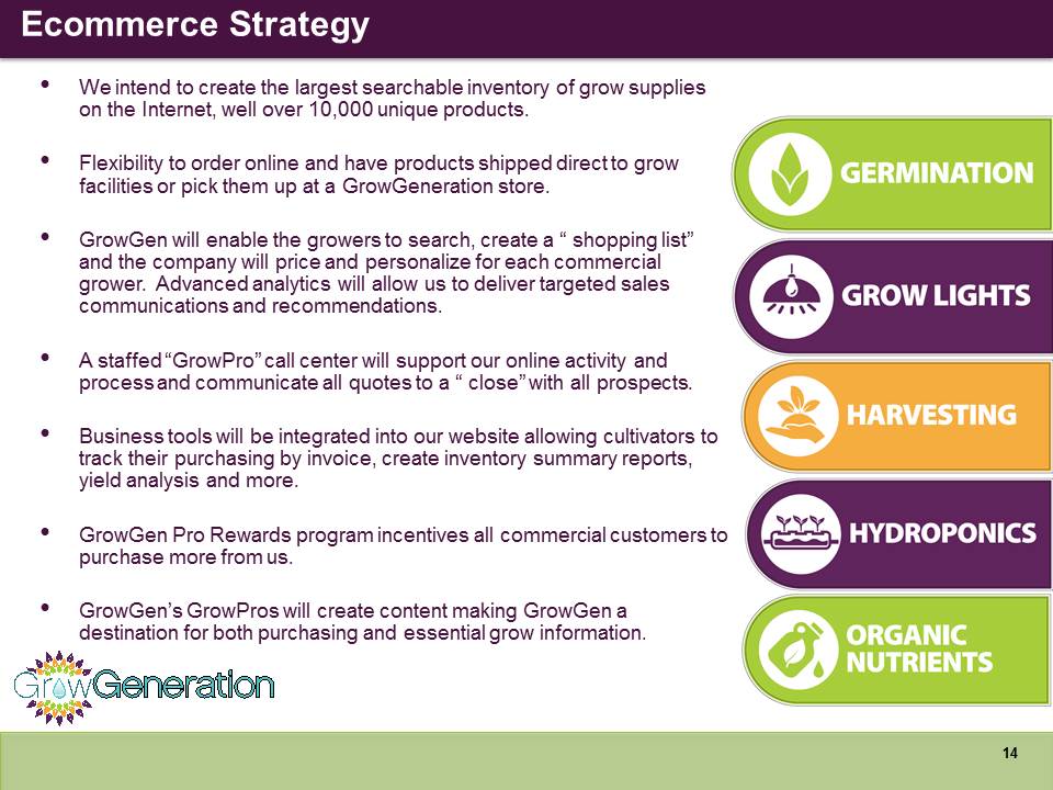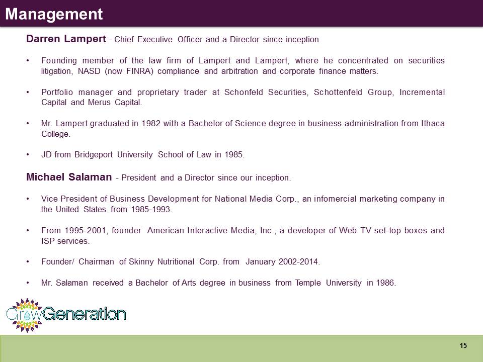 Ecommerce Strategy • We intend to create the largest searchable inventory of grow supplies on the Internet, well over 10,000 unique products. • Flexibility to order online and have products shipped direct to grow facilities or pick them up at a GrowGeneration store. • GrowGen will enable the growers to search, create a “ shopping list” and the company will price and personalize for each commercial grower. Advanced analytics will allow us to deliver targeted sales communications and recommendations. • A staffed “GrowPro” call center will support our online activity and process and communicate all quotes to a “ close” with all prospects. • Business tools will be integrated into our website allowing cultivators to track their purchasing by invoice, create inventory summary reports, yield analysis and more. • GrowGen Pro Rewards program incentives all commercial customers to purchase more from us. • GrowGen’s GrowPros will create content making GrowGen a destination for both purchasing and essential grow information. 14