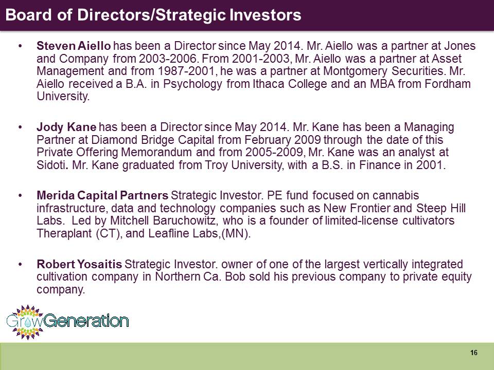 • Steven Aiello has been a Director since May 2014. Mr. Aiello was a partner at Jones and Company from 2003 - 2006. From 2001 - 2003, Mr. Aiello was a partner at Asset Management and from 1987 - 2001, he was a partner at Montgomery Securities. Mr. Aiello received a B.A. in Psychology from Ithaca College and an MBA from Fordham University. • Jody Kane has been a Director since May 2014. Mr. Kane has been a Managing Partner at Diamond Bridge Capital from February 2009 through the date of this Private Offering Memorandum and from 2005 - 2009, Mr. Kane was an analyst at Sidoti . Mr. Kane graduated from Troy University, with a B.S. in Finance in 2001. • Merida Capital Partners Strategic Investor. PE fund focused on cannabis infrastructure, data and technology companies such as New Frontier and Steep Hill Labs. Led by Mitchell Baruchowitz, who is a founder of limited - license cultivators Theraplant (CT), and Leafline Labs,(MN). • Robert Yosaitis Strategic Investor. owner of one of the largest vertically integrated cultivation company in Northern Ca. Bob sold his previous company to private equity company. Board of Directors/Strategic Investors 16