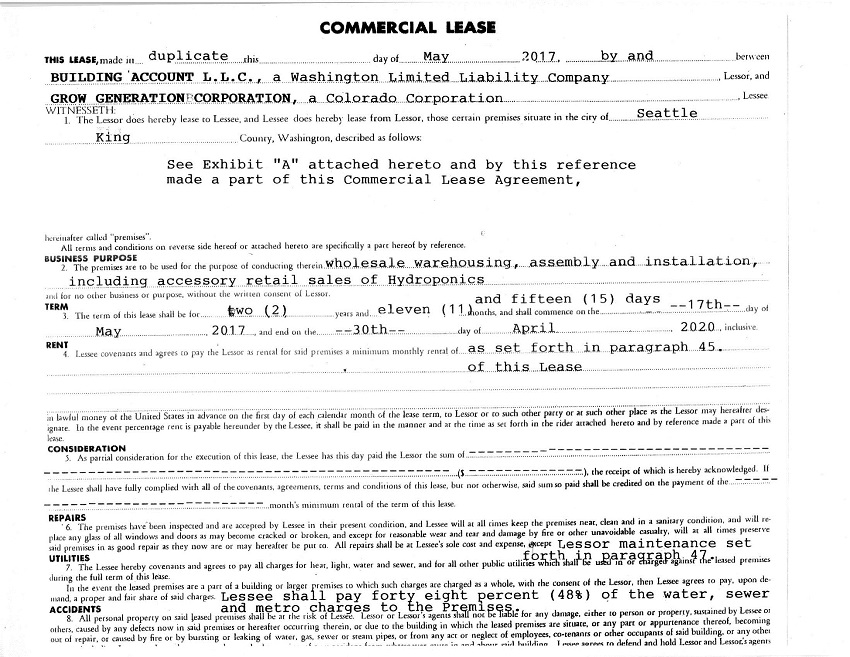31. As provided in Termination of Lease Agreement dated May 1, 2017 for Commercial Lease dated August 23, 2011 and First Lease Extension Agreement dated July 15, 2013 and Second Lease Extension Agreement dated April 13, 2016 by and between Building Account L.L.C. and Seattle’s Hydro Spot L.L.C., and provided for in the Agreement to Purchase and Sell Assets Agreement by and between Seattle’s Hydro Spot L.L.C. and Grow Generation Corporation, dated March 6, 2017, the security deposit in the amount of TWO THOUSAND EIGHT HUNDRED AND FIFTY AND NO/100 DOLLARS ($2,850.00) shall be assigned to Lessee and Lessor agrees that said security deposit has this day been paid to Lessor. Upon execution of this Lease, Lessee agrees to pay Lessor an additional security deposit in the sum of SEVEN HUNDRED SEVENTY FIVE AND NO/100 DOLLARS ($775.00) for a total security deposit of THREE THOUSAND SIX HUNDRED TWENTY FIVE AND NO/100 DOLLARS ($3,625.00) as security for Lessee’s faithful performance of Lessee’s obligations hereunder. If the Lessee fails to pay rent or other charges due hereunder, or otherwise defaults with respect to any provision of this lease, Lessor may use, apply or retain all or any portion of said deposit for the payment of any rent or other charge in default or for the payment of any other sum to which Lessor may suffer thereby. If Lessor so uses or applies all or any portion of said deposit, Lessee shall within ten (10) days after written demand therefore deposit cash with Lessor in an amount sufficient to restore said deposit to the full amount stated above and Lessee’s failure to do so shall be a breach of this lease. Lessor shall not be required to keep said deposit separate from Lessor’s general accounts. If Lessee performs all of Lessee’s obligations hereunder, said deposit or so much thereof as had not theretofore been applied by Lessor, shall be returned, without payment of interest for its use, to Lessee within fifteen (15) days after expiration of the lease term, or after Lessee has vacated the premises, whichever is later.