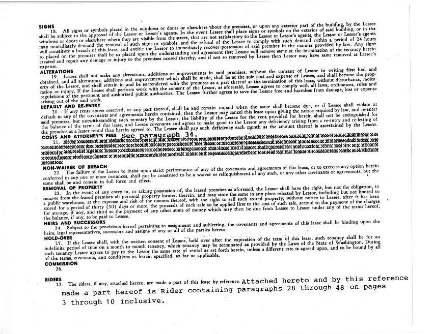 48. Lessor and Lessee herein acknowledge that Barry M. Hawley and Brett Hawley, Hawley Realty Inc. has provided them with a pamphlet on the Law of Real Estate Agency as required by the law. In this transaction Barry M. Hawley and Brett Hawley, Hawley Realty Inc. represents the Lessor. Lessee had no representation in this real estate transaction. Each party signing this document confirms that prior oral and/or written disclosure of agency was given to them in this transaction.