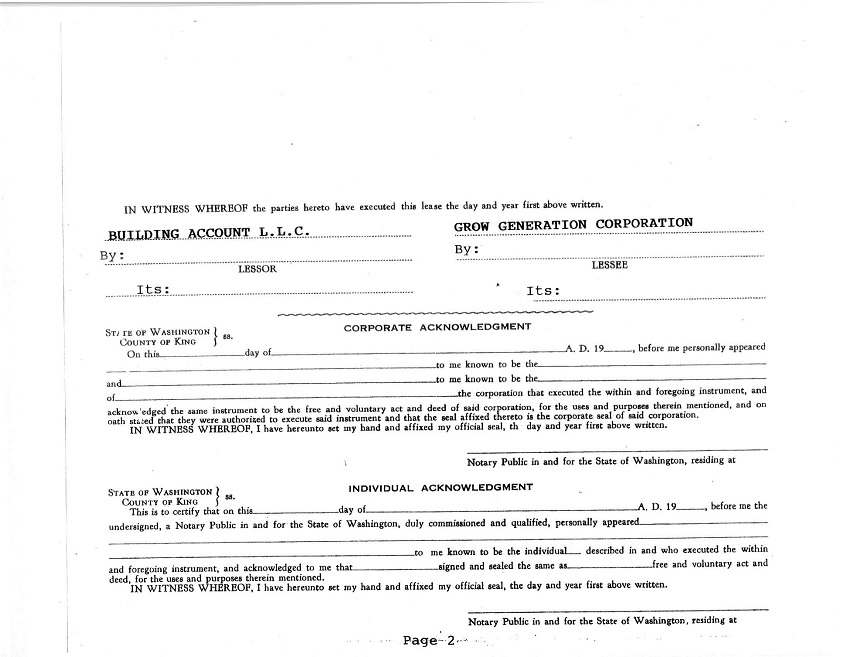 This is to certify that on this _____ day of May, 2017, before me the undersigned, a Notary Public in and for the State of Washington, duly commissioned and qualified, personally appeared________________________________ to me known to be the_______________________ of GROW GENERATION CORPORATION, the corporation that executed the within and foregoing instrument, and acknowledged the same instrument to be the free and voluntary act and deed of said corporation, for the uses and purposes therein mentioned, and on oath stated that he was authorized to execute said instrument.