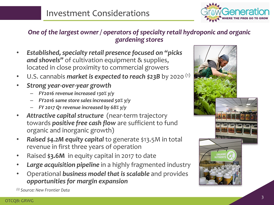 OTCQB: GRWG 2 Safe Harbor Statement This presentation is being provided for information purposes only and does not constitute an offer to sell or a solicitation of an offer to purchase any of the Company’s securities . This presentation is not intended, nor should it be distributed, for advertising purposes, nor is it intended for broadcast or publication to the general public . Any such offer of the Company’s securities will only be made in compliance with applicable state and federal securities laws pursuant to a prospectus or an offering memorandum and related offering documents which will be provided to qualified prospective investors upon request . This presentation may include predictions, estimates or other information that might be considered forward - looking within the meaning of applicable securities laws . While these forward - looking statements represent our current judgments, they are subject to risks and uncertainties that could cause actual results to differ materially . You are cautioned not to place undue reliance on these forward - looking statements, which reflect our opinions only as of the date of this presentation . Please keep in mind that we are not obligating ourselves to revise or publicly release the results of any revision to these forward - looking statements in light of new information or future events . When used herein, words such as "look forward," "believe," "continue," "building," or variations of such words and similar expressions are intended to identify forward - looking statements . Factors that could cause actual results to differ materially from those contemplated in any forward - looking statements made by us herein are often discussed in filings we make with the United States Securities and Exchange Commission, available at : www . sec . gov, and on our website, at : www . growgeneration . com . growgeneration.com