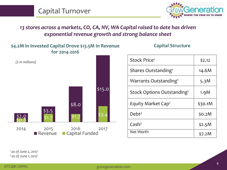 OTCQB: GRWG 3 Investment Considerations • Established, specialty retail presence focused on “picks and shovels” of cultivation equipment & supplies, located in close proximity to commercial growers • U.S. cannabis market is expected to reach $23B by 2020 (1) • Strong year - over - year growth – FY2016 revenue increased 130% y/y – FY2016 same store sales increased 50% y/y – FY 2017 Q1 revenue increased by 68% y/y • Attractive capital structure (near - term trajectory towards positive free cash flow are sufficient to fund organic and inorganic growth) • Raised $4.2M equity capital to generate $13.5M in total revenue in first three years of operation • Raised $3.6M in equity capital in 2017 to date • Large acquisition pipeline in a highly fragmented industry • Operational business model that is scalable and provides opportunities for margin expansion One of the largest owner / operators of specialty retail hydroponic and organic gardening stores (1) Source: New Frontier Data