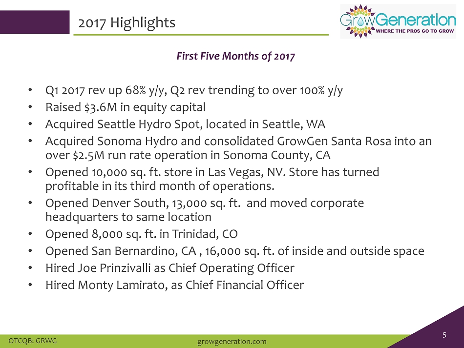 OTCQB: GRWG 5 2017 Highlights • Q1 2017 rev up 68% y/y, Q2 rev trending to over 100% y/y • Raised $3.6M in equity capital • Acquired Seattle Hydro Spot, located in Seattle, WA • Acquired Sonoma Hydro and consolidated GrowGen Santa Rosa into an over $2.5M run rate operation in Sonoma County, CA • Opened 10,000 sq. ft. store in Las Vegas, NV. Store has turned profitable in its third month of operations. • Opened Denver South, 13,000 sq. ft. and moved corporate headquarters to same location • Opened 8,000 sq. ft. in Trinidad, CO • Opened San Bernardino, CA , 16,000 sq. ft. of inside and outside space • Hired Joe Prinzivalli as Chief Operating Officer • Hired Monty Lamirato, as Chief Financial Officer First Five Months of 2017 growgeneration.com