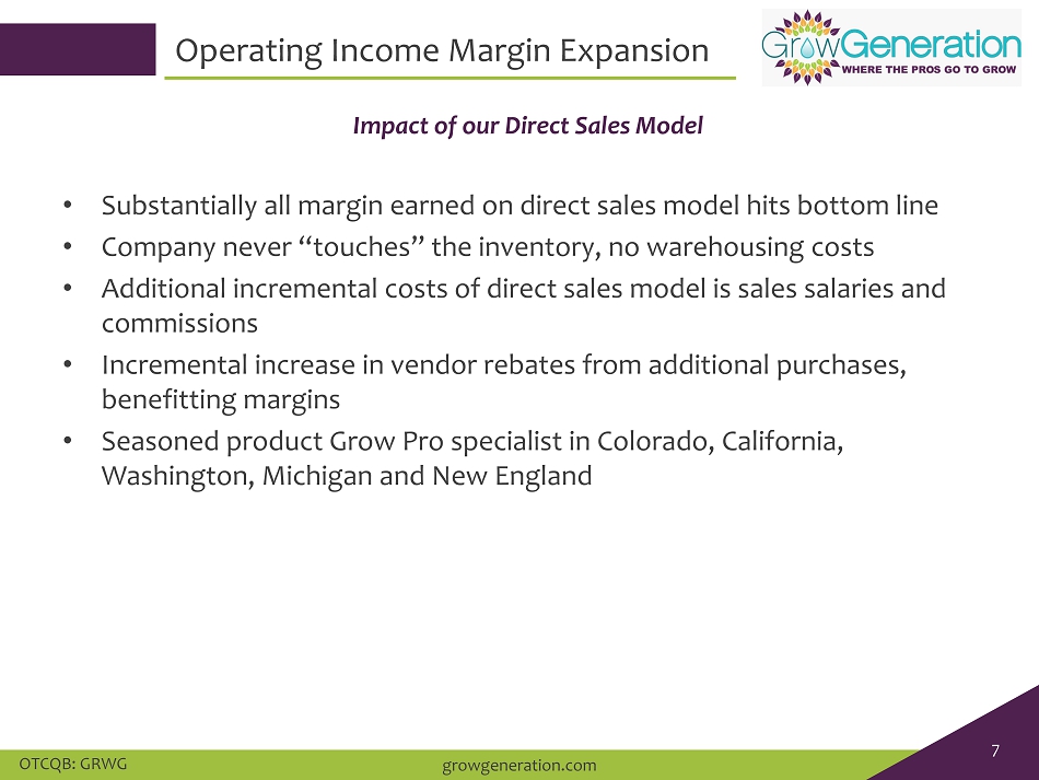 OTCQB: GRWG 6 Key Financial Metrics Attractive business profile for increasing shareholder value Gross Margin ~30% - 35% 27.6% Target 2016 Capital Turnover 3X $ Each $1M in capital drives ~$3M in annual revenue Commercial Cannabis Grower 15 - 20% of total sales will be invested in hydroponic and ancillary equipment and supplies by retail and medical cannabis growers annually “Typical” Store Profile ~7,500 - 10,000 sq. ft. ~18% op. margin Rent ~$10 sq. ft. growgeneration.com