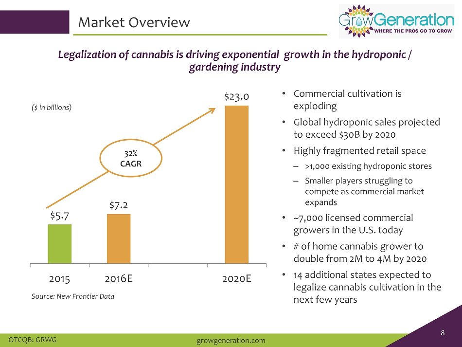 OTCQB: GRWG 17 Investment Considerations • Established, specialty retail presence focused on “picks and shovels” of cultivation equipment & supplies, located in close proximity to commercial growers • U.S. cannabis market is expected to reach $23B by 2020 (1) • Strong year - over - year growth – FY2016 revenue increased 130% y/y – FY2016 same store sales increased 50% y/y – FY 2017 revenue trending towards 100% increase y/y • Attractive capital structure (Near - term trajectory towards positive free cash flow are sufficient to fund organic and inorganic growth • Raised $4.2M equity capital to generate $13.5M in total revenue in first three years of operation • Raised $3.6M in equity capital in 2017 to date • Large acquisition pipeline in a highly fragmented industry • Operational business model that is scalable and provides opportunities for margin expansion One of the largest owner / operators of specialty retail hydroponic and organic gardening stores (1) Source: New Frontier Data growgeneration.com