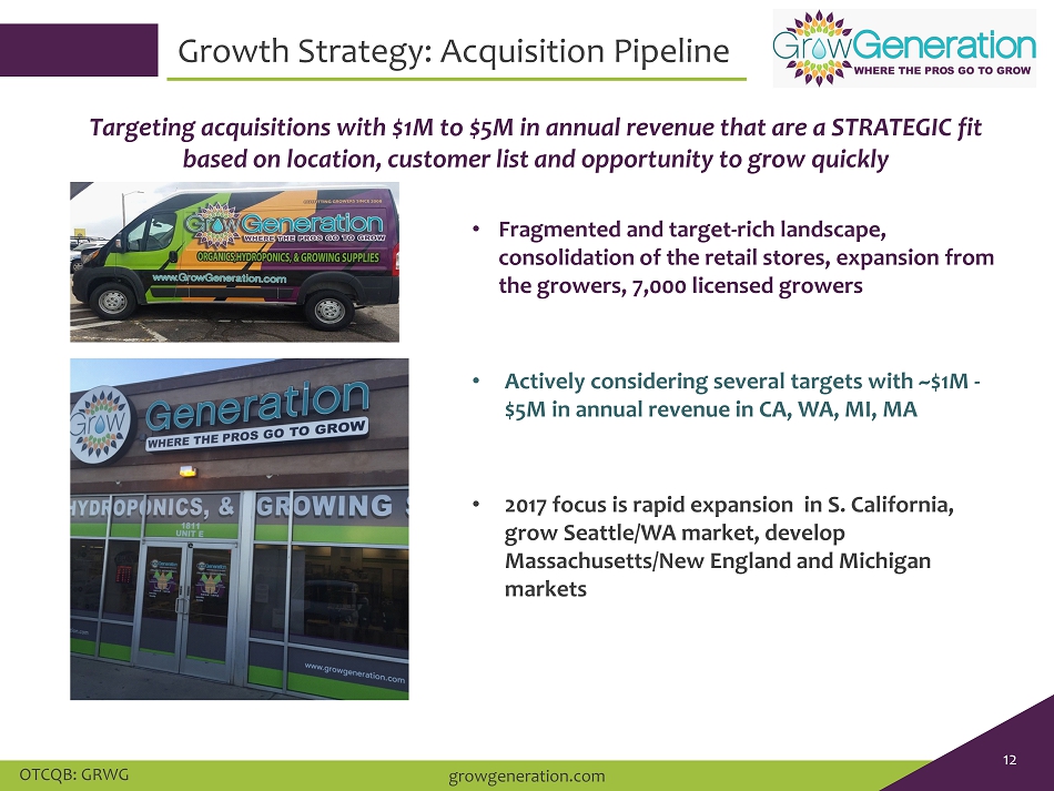 OTCQB: GRWG 11 Growth Strategy: National Expansion Growth to be fueled by both new store openings and acquisitions 13 stores, 4 states 20 stores, 10 states by 2018 Alabama Arizona Arkansas California (2) Colorado (9) Florida Georgia Idaho Illinois Indiana Iowa Kansas Kentucky Louisiana Maine Massachusetts Michigan Minnesota Mississippi Missouri Montana Nebraska Nevada (1) New Hampshire New Mexico New York North Carolina North Dakota Ohio Oklahoma Oregon Pennsylvania South Carolina South Dakota Tennessee Texas Utah Vermont Virginia Washington ( (1) W.Va Wisconsin Wyoming Connecticut Maryland Rhode Island • Current operations in 13 stores across 4 states/ over 50% sss growth • Q2 2017 expansion markets: San Bernardino, CA and Seattle, WA • 2017 growth markets: Denver, Las Vegas, Northern and Southern Ca. • Further expansion: MA, MI, OH, PA, MD, and FL. - Current Operations - Targeted for Expansion in 2017 - 2018 growgeneration.com