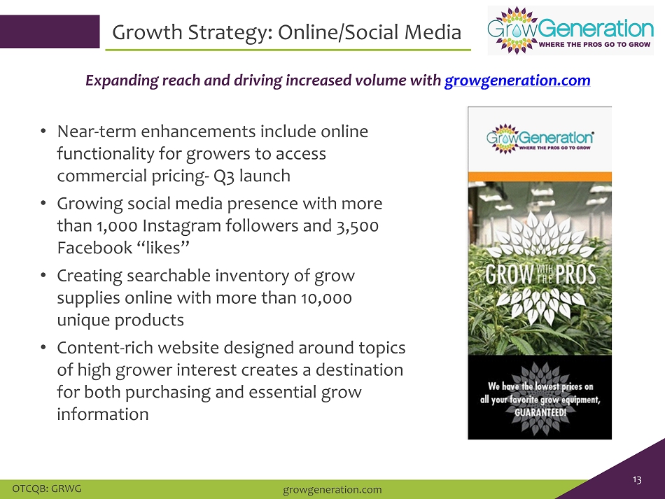 OTCQB: GRWG 12 Growth Strategy: Acquisition Pipeline Targeting acquisitions with $1M to $5M in annual revenue that are a STRATEGIC fit based on location, customer list and opportunity to grow quickly • Fragmented and target - rich landscape, consolidation of the retail stores, expansion from the growers, 7,000 licensed growers • Actively considering several targets with ~$1M - $5M in annual revenue in CA, WA, MI, MA • 2017 focus is rapid expansion in S. California, grow Seattle/WA market, develop Massachusetts/New England and Michigan markets growgeneration.com