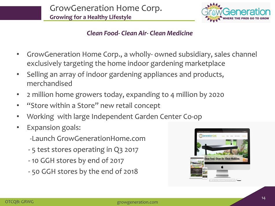 OTCQB: GRWG 13 Growth Strategy: Online/Social Media • Near - term enhancements include online functionality for growers to access commercial pricing - Q3 launch • Growing social media presence with more than 1,000 Instagram followers and 3,500 Facebook “likes” • Creating searchable inventory of grow supplies online with more than 10,000 unique products • Content - rich website designed around topics of high grower interest creates a destination for both purchasing and essential grow information Expanding reach and driving increased volume with growgeneration.com growgeneration.com