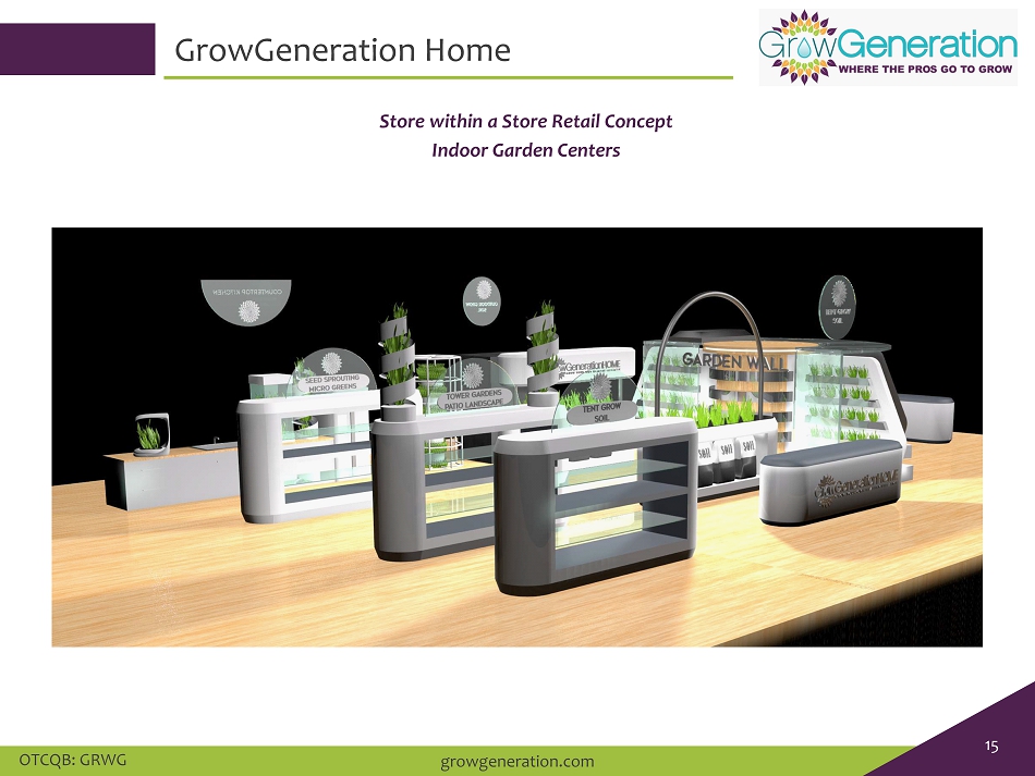 OTCQB: GRWG 14 GrowGeneration Home Corp. Growing for a Healthy Lifestyle Clean Food - Clean Air - Clean Medicine • GrowGeneration Home Corp., a wholly - owned subsidiary, sales channel exclusively targeting the home indoor gardening marketplace • Selling an array of indoor gardening appliances and products, merchandised • 2 million home growers today, expanding to 4 million by 2020 • “Store within a Store” new retail concept • Working with large Independent Garden Center Co - op • Expansion goals: - Launch GrowGenerationHome.com - 5 test stores operating in Q3 2017 - 10 GGH stores by end of 2017 - 50 GGH stores by the end of 2018 growgeneration.com