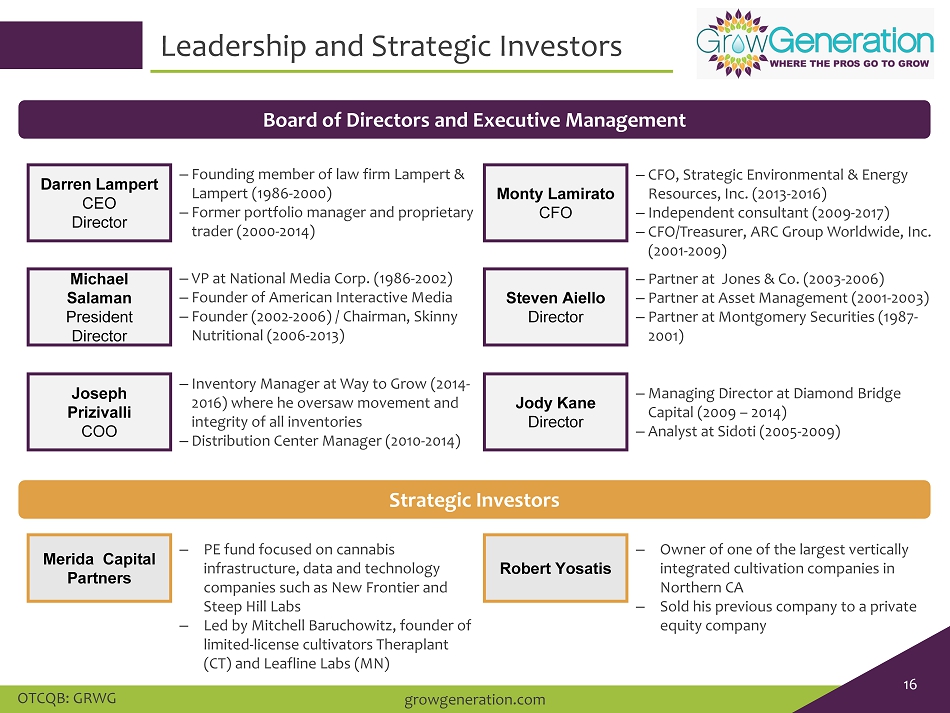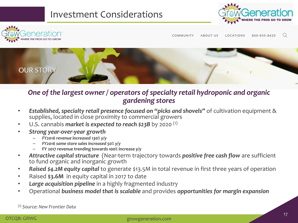 OTCQB: GRWG 16 Leadership and Strategic Investors Strategic Investors Board of Directors and Executive Management Darren Lampert CEO Director Steven Aiello Director Jody Kane Director Merida Capital Partners Robert Yosatis Michael Salaman President Director ‒ Founding member of law firm Lampert & Lampert (1986 - 2000) ‒ Former portfolio manager and proprietary trader (2000 - 2014) ‒ VP at National Media Corp. (1986 - 2002) ‒ Founder of American Interactive Media ‒ Founder (2002 - 2006) / Chairman, Skinny Nutritional (2006 - 2013) ‒ Partner at Jones & Co. (2003 - 2006) ‒ Partner at Asset Management (2001 - 2003) ‒ Partner at Montgomery Securities (1987 - 2001) ‒ Managing Director at Diamond Bridge Capital (2009 – 2014) ‒ Analyst at Sidoti (2005 - 2009) ‒ PE fund focused on cannabis infrastructure, data and technology companies such as New Frontier and Steep Hill Labs ‒ Led by Mitchell Baruchowitz, founder of limited - license cultivators Theraplant (CT) and Leafline Labs (MN) ‒ Owner of one of the largest vertically integrated cultivation companies in Northern CA ‒ Sold his previous company to a private equity company Joseph Prizivalli COO ‒ Inventory Manager at Way to Grow (2014 - 2016) where he oversaw movement and integrity of all inventories ‒ Distribution Center Manager (2010 - 2014) Monty Lamirato CFO ‒ CFO, Strategic Environmental & Energy Resources, Inc. (2013 - 2016) ‒ Independent consultant (2009 - 2017) ‒ CFO/Treasurer, ARC Group Worldwide, Inc. (2001 - 2009) growgeneration.com