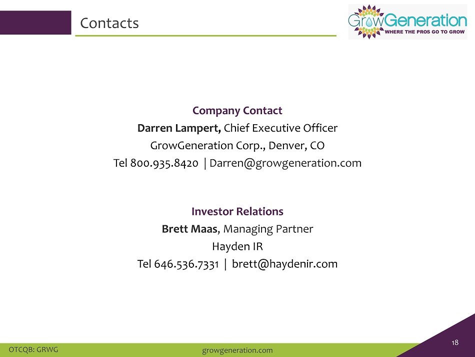 OTCQB: GRWG 18 Contacts Company Contact Darren Lampert , Chief Executive Officer GrowGeneration Corp., Denver, CO Tel 800.935.8420 | Darren@growgeneration.com Investor Relations Brett Maas , Managing Partner Hayden IR Tel 646.536.7331 | brett@haydenir.com growgeneration.com
