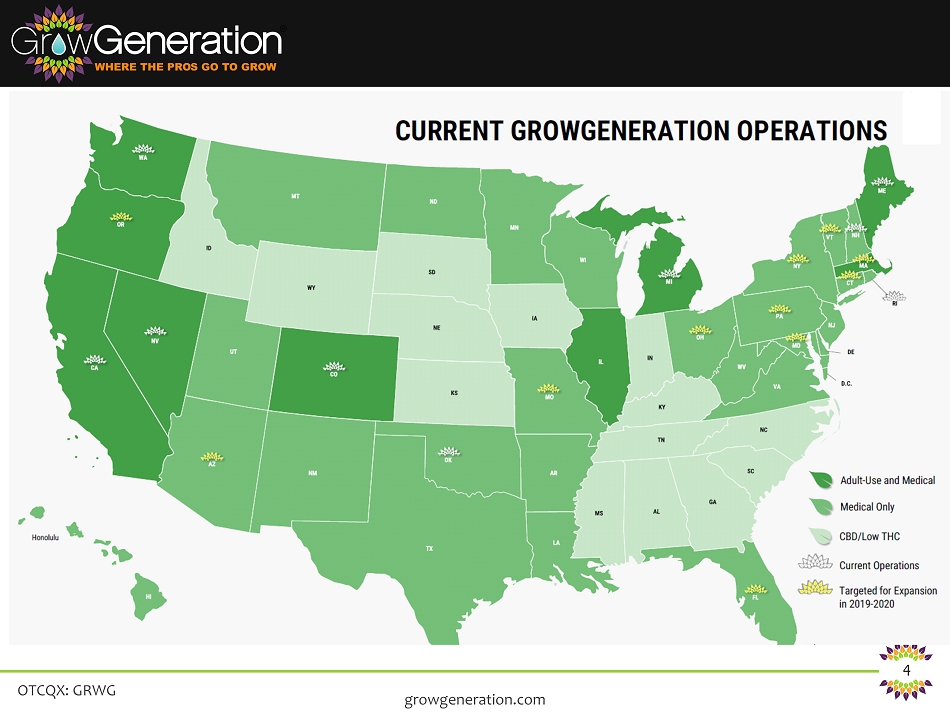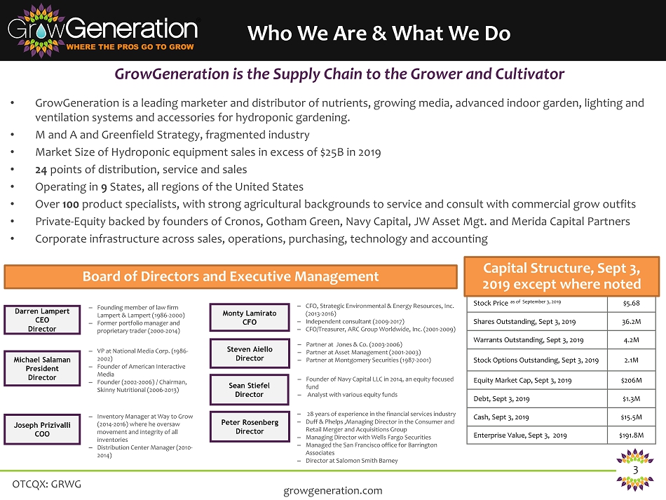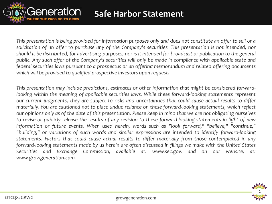 OTCQX: GRWG 2 Safe Harbor Statement This presentation is being provided for information purposes only and does not constitute an offer to sell or a solicitation of an offer to purchase any of the Company’s securities . This presentation is not intended, nor should it be distributed, for advertising purposes, nor is it intended for broadcast or publication to the general public . Any such offer of the Company’s securities will only be made in compliance with applicable state and federal securities laws pursuant to a prospectus or an offering memorandum and related offering documents which will be provided to qualified prospective investors upon request . This presentation may include predictions, estimates or other information that might be considered forward - looking within the meaning of applicable securities laws . While these forward - looking statements represent our current judgments, they are subject to risks and uncertainties that could cause actual results to differ materially . You are cautioned not to place undue reliance on these forward - looking statements, which reflect our opinions only as of the date of this presentation . Please keep in mind that we are not obligating ourselves to revise or publicly release the results of any revision to these forward - looking statements in light of new information or future events . When used herein, words such as "look forward," "believe," "continue," "building," or variations of such words and similar expressions are intended to identify forward - looking statements . Factors that could cause actual results to differ materially from those contemplated in any forward - looking statements made by us herein are often discussed in filings we make with the United States Securities and Exchange Commission, available at : www . sec . gov, and on our website, at : www . growgeneration . com . growgeneration.com