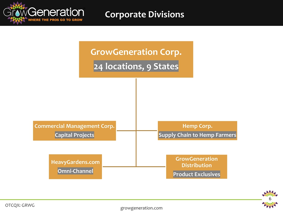 OTCQX: GRWG 5 GrowGeneration Expansion Strategy growgeneration.com Potential one of the largest adult use markets 107 potential licenses once recreational licensing opens in 2020 224 active cultivation licenses (THC & CBD) Largest concentrated of licenses are in Clark County Medical and recreational market Roughly 70 active cultivation licenses in the stat. 97 licenses are pending CCC final approval 21 active cultivation licenses Current data would suggest a location in the middle of the state Opening of a recreational license round in late 2019 would add a robust pipeline of craft cultivators (5,000 - 15,000 SF) facilities throughout the state 60 cultivation licenses to be awarded on December 31, 2019 7 licenses per each of the 8 congressional districts