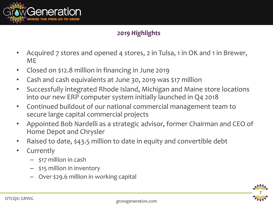 OTCQX: GRWG 6 growgeneration.com GrowGeneration Corp. 24 locations, 9 States HeavyGardens.com Omni - Channel Hemp Corp. Supply Chain to Hemp Farmers Commercial Management Corp. Capital Projects GrowGeneration Distribution Product Exclusives Corporate Divisions