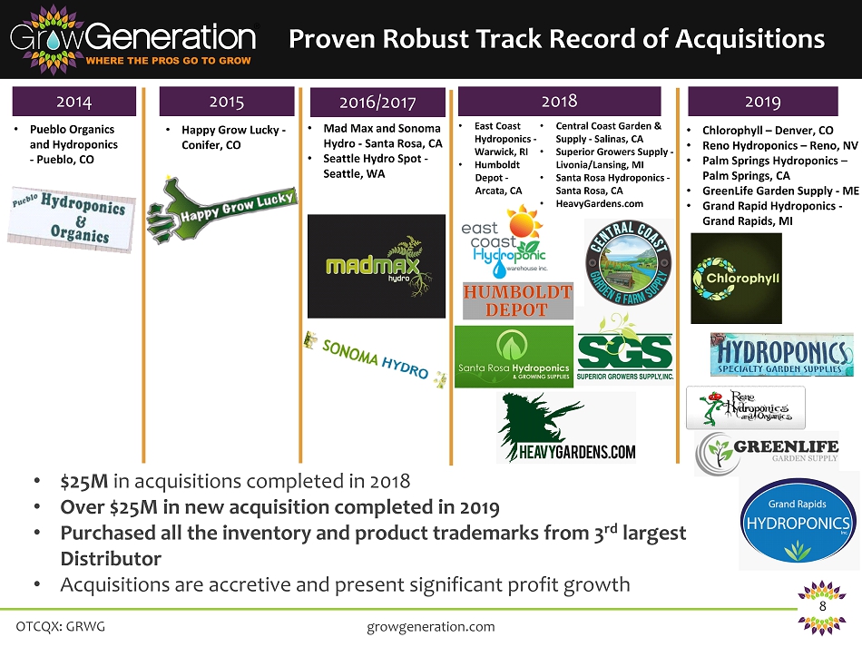 OTCQX: GRWG 7 • Acquired 7 stores and opened 4 stores, 2 in Tulsa, 1 in OK and 1 in Brewer, ME • Closed on $12.8 million in financing in June 2019 • Cash and cash equivalents at June 30, 2019 was $17 million • Successfully integrated Rhode Island, Michigan and Maine store locations into our new ERP computer system initially launched in Q4 2018 • Continued buildout of our national commercial management team to secure large capital commercial projects • Appointed Bob Nardelli as a strategic advisor, former Chairman and CEO of Home Depot and Chrysler • Raised to date, $43.5 million to date in equity and convertible debt • Currently – $17 million in cash – $15 million in inventory – Over $29.6 million in working capital 2019 Highlights growgeneration.com