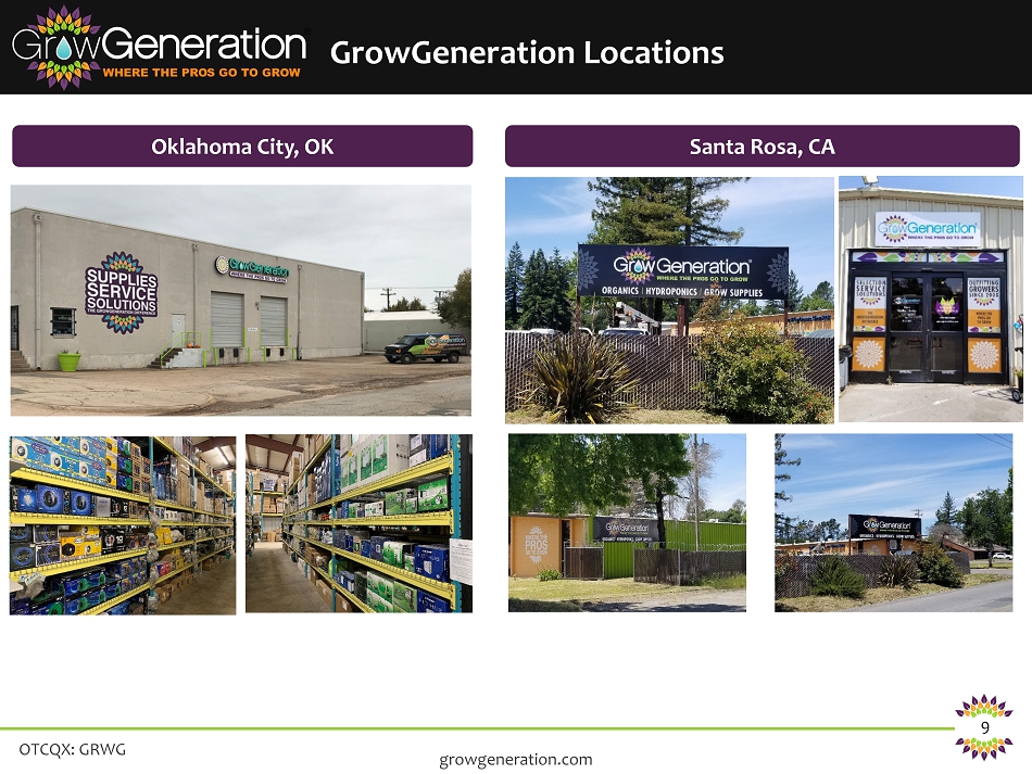 OTCQX: GRWG 8 growgeneration.com 2016/2017 2015 2014 2018 • $25M in acquisitions completed in 2018 • Over $25M in new acquisition completed in 2019 • Purchased all the inventory and product trademarks from 3 rd largest Distributor • Acquisitions are accretive and present significant profit growth • East Coast Hydroponics - Warwick, RI • Humboldt Depot - Arcata, CA • Mad Max and Sonoma Hydro - Santa Rosa, CA • Seattle Hydro Spot - Seattle, WA • Happy Grow Lucky - Conifer, CO • Pueblo Organics and Hydroponics - Pueblo, CO 2019 • Chlorophyll – Denver, CO • Reno Hydroponics – Reno, NV • Palm Springs Hydroponics – Palm Springs, CA • GreenLife Garden Supply - ME • Grand Rapid Hydroponics - Grand Rapids, MI • Central Coast Garden & Supply - Salinas, CA • Superior Growers Supply - Livonia/Lansing, MI • Santa Rosa Hydroponics - Santa Rosa, CA • HeavyGardens.com Proven Robust Track Record of Acquisitions