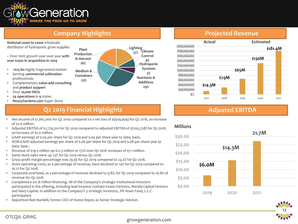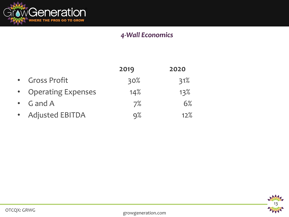 OTCQX: GRWG 12 growgeneration.com National coast to coast wholesale distributor of hydroponic grow supplies – Over 100% growth year over year with over $25m in acquisition in 2019 • ~$25 bn highly fragmented market • Serving commercial cultivation professionals • Complementary value - add consulting and product support • Over 10,000 SKUs • 24 operations in 9 states • HeavyGardens.com Super Store Lighting 17% Climate Control 8% Hydroponic Systems 5% Nutrients & Additives 29% Medium & Containers 23% Plant Production & Harvest 18% $- $20,000,000 $40,000,000 $60,000,000 $80,000,000 $100,000,000 $120,000,000 $140,000,000 $160,000,000 $180,000,000 $200,000,000 2017 2018 2019 2020 2021 $14.3M $29M $65M $130M $181.4M Projected Revenue Company Highlights Adjusted EBITDA $0.00 $5.00 $10.00 $15.00 $20.00 $25.00 $30.00 2019 2020 2021 21.7M $14.3M $6.0M Q2 2019 Financial Highlights • Net income of $1,062,000 for Q2 2019 compared to a net loss of $(929,959) for Q2 2018, an increase of $2.0 million. • Adjusted EBITDA of $1,779,310 for Q2 2019 compared to adjusted EBITDA of $(205,758) for Q2 2018, an increase of $2.0 million. • GAAP earnings of $.04 per share for Q2 2019 and $.04 per share year to date, basic. • NON - GAAP adjusted earnings per share of $.06 per share for Q2 2019 and $.08 per share year to date, basic. • Revenue of $19.5 million up $12.3 million or 172% over Q2 2018 revenues of $7.1 million. • Same store sales were up 23% for Q2 2019 versus Q2 2018. • Gross profit margin percentage was 29.9% for Q2 2019 compared to 24.2% for Q2 2018. • Store operating costs, as a percentage of revenue, have declined to 14% for Q2 2019 compared to 16.1% for Q2 2018. • Corporate overhead, as a percentage of revenue declined to 9.8%, for Q2 2019 compared to 16.8% of revenue for Q2 2018. • Completed a $12.8 million financing. All of the Company's strategic institutional investors participated in the offering, including lead investor Gotham Green Partners, Merida Capital Partners and Navy Capital. In addition to the Company's 3 strategic investors, JW Asset Fund, L.L.C. participated. • Appointed Bob Nardelli, former CEO of Home Depot, as Senior Strategic Advisor. Actual Estimated Millions