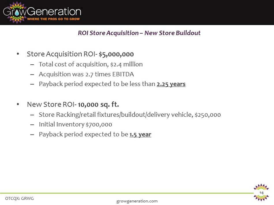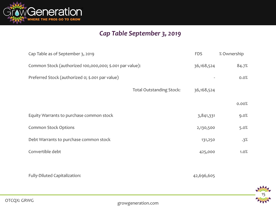 OTCQX: GRWG 14 • Store Acquisition ROI - $5,000,000 – Total cost of acquisition, $2.4 million – Acquisition was 2.7 times EBITDA – Payback period expected to be less than 2.25 years • New Store ROI - 10,000 sq. ft. – Store Racking/retail fixtures/buildout/delivery vehicle, $250,000 – Initial Inventory $700,000 – Payback period expected to be 1.5 year ROI Store Acquisition – New Store Buildout growgeneration.com