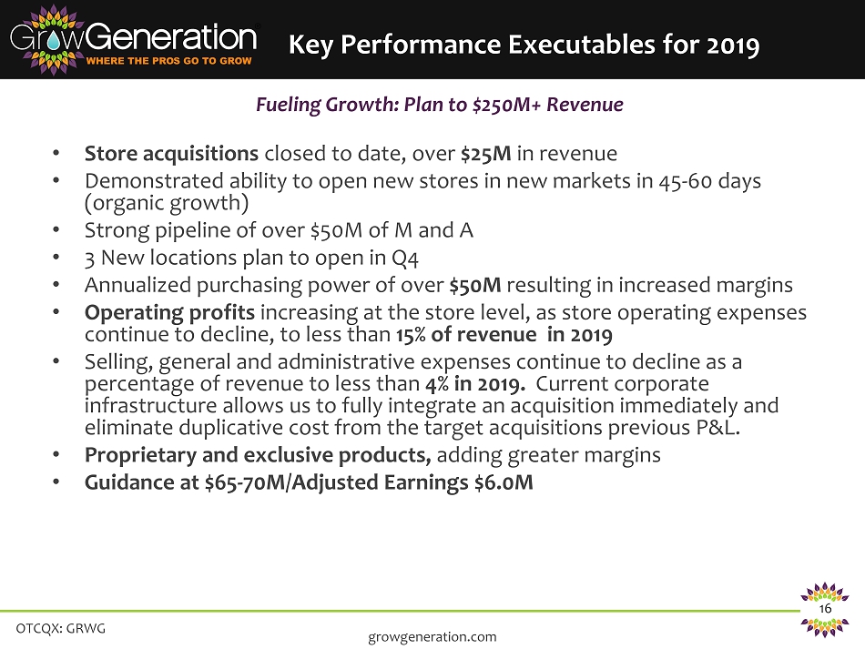 OTCQX: GRWG 16 • Store acquisitions closed to date, over $25M in revenue • Demonstrated ability to open new stores in new markets in 45 - 60 days (organic growth) • Strong pipeline of over $50M of M and A • 3 New locations plan to open in Q4 • Annualized purchasing power of over $50M resulting in increased margins • Operating profits increasing at the store level, as store operating expenses continue to decline, to less than 15% of revenue in 2019 • Selling, general and administrative expenses continue to decline as a percentage of revenue to less than 4% in 2019. Current corporate infrastructure allows us to fully integrate an acquisition immediately and eliminate duplicative cost from the target acquisitions previous P&L. • Proprietary and exclusive products, adding greater margins • Guidance at $65 - 70M/Adjusted Earnings $6.0M Fueling Growth: Plan to $250M+ Revenue growgeneration.com Key Performance Executables for 2019
