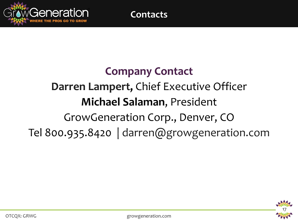OTCQX: GRWG 17 Company Contact Darren Lampert , Chief Executive Officer Michael Salaman , President GrowGeneration Corp., Denver, CO Tel 800.935.8420 | darren@growgeneration.com growgeneration.com Contacts