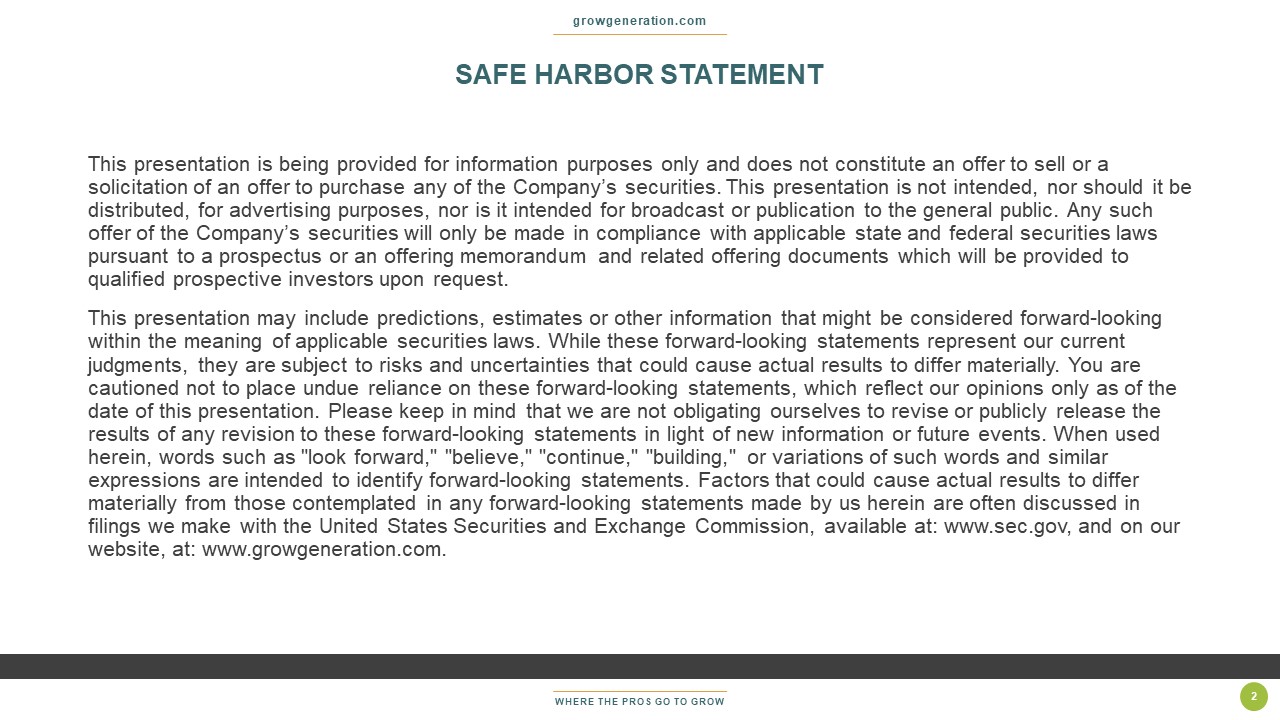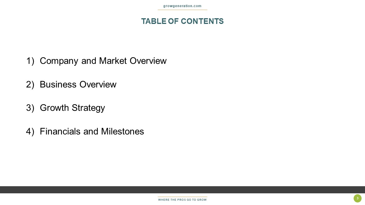 WHERE THE PROS GO TO GROW SAFE HARBOR STATEMENT This presentation is being provided for information purposes only and does not constitute an offer to sell or a solicitation of an offer to purchase any of the Company’s securities. This presentation is not intended, nor should it be distributed, for advertising purposes, nor is it intended for broadcast or publication to the general public. Any such offer of the Company’s securities will only be made in compliance with applicable state and federal securities laws pursuant to a prospectus or an offering memorandum and related offering documents which will be provided to qualified prospective investors upon request. This presentation may include predictions, estimates or other information that might be considered forward - looking within the meaning of applicable securities laws. While these forward - looking statements represent our current judgments, they are subject to risks and uncertainties that could cause actual results to differ materially. You are cautioned not to place undue reliance on these forward - looking statements, which reflect our opinions only as of the date of this presentation. Please keep in mind that we are not obligating ourselves to revise or publicly release the results of any revision to these forward - looking statements in light of new information or future events. When used herein, words such as "look forward," "believe," "continue," "building," or variations of such words and similar expressions are intended to identify forward - looking statements. Factors that could cause actual results to differ materially from those contemplated in any forward - looking statements made by us herein are often discussed in filings we make with the United States Securities and Exchange Commission, available at: www.sec.gov, and on our website, at: www.growgeneration.com. growgeneration.com 2