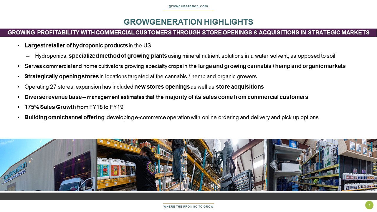 WHERE THE PROS GO TO GROW SEASONED MANAGEMENT TEAM & BOARD OF DIRECTORS growgeneration.com Darren Lampert CEO, Director • Founding member of law firm Lampert & Lampert (1986 - 2000) • Former portfolio manager and proprietary trader (2000 - 2014) Michael Salaman President, Director • VP at National Media Corp. (1986 - 2002) • Founder of American Interactive Media • Founder (2002 - 2006) / Chairman, Skinny Nutritional (2006 - 2013) Tony Sullivan COO • 20+ years at Foot Locker Inc. • EVP and COO of Forman Mills • SVP Operations for Dollar Express • SVP, COO Anna’s Linens Monty Lamirato CFO • CFO, Strategic Environmental & Energy Resources, Inc. (2013 - 2016) • Independent consultant (2009 - 2017) • CFO/Treasurer, ARC Group Worldwide, Inc. (2001 - 2009) 6 Sean Stiefel Director • Founder of Navy Capital LLC in 2014, an equity focused fund • Analyst with various equity funds Steven Aiello Director • Partner at Jones & Co. (2003 - 2006) • Partner at Asset Management (2001 - 2003) • Partner at Montgomery Securities (1987 - 2001) Paul Ciasullo Director Strong Private Equity Backing • Private Equity backed by founders of Cronos, Gotham Green, Navy Capital, JW Asset Merida Capital Partners Bob Nardelli Senior Strategic Advisor • Former CEO of Home Depot