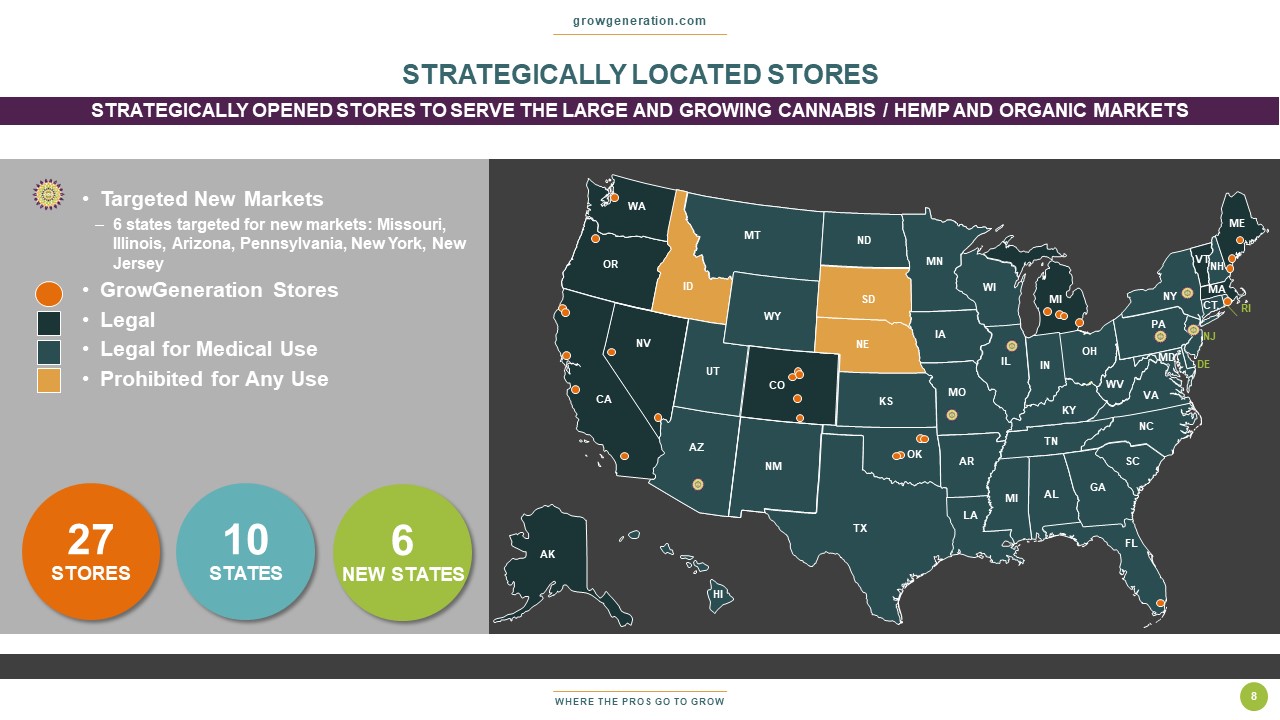 WHERE THE PROS GO TO GROW growgeneration.com 7 • Largest retailer of hydroponic products in the US – Hydroponics: specialized method of growing plants using mineral nutrient solutions in a water solvent, as opposed to soil • Serves commercial and home cultivators growing specialty crops in the large and growing cannabis / hemp and organic markets • Strategically opening stores in locations targeted at the cannabis / hemp and organic growers • Operating 27 stores: expansion has included new stores openings as well as store acquisitions • Diverse revenue base – management estimates that the majority of its sales come from commercial customers • 175% Sales Growth from FY18 to FY19 • Building omnichannel offering : developing e - commerce operation with online ordering and delivery and pick up options GROWGENERATION HIGHLIGHTS GROWING PROFITABILITY WITH COMMERCIAL CUSTOMERS THROUGH STORE OP ENINGS & ACQUISITIONS IN STRATEGIC MARKETS