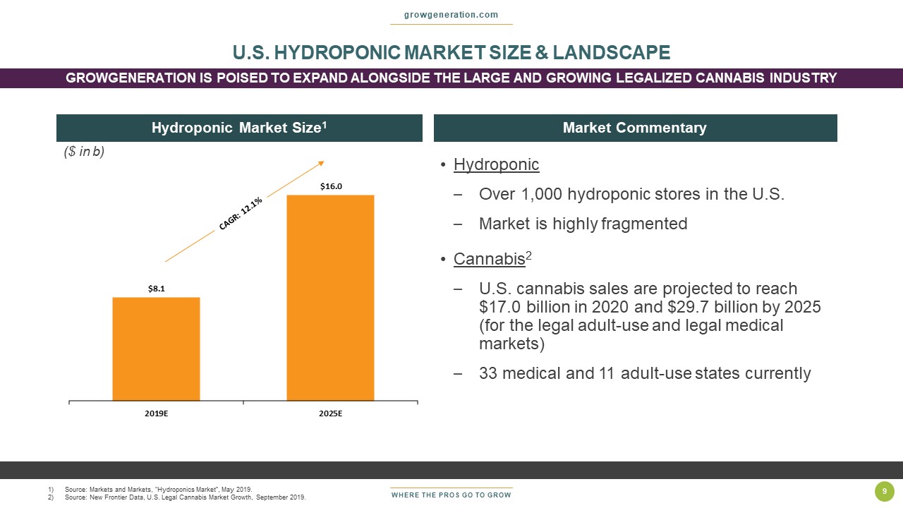 WHERE THE PROS GO TO GROW growgeneration.com 8 27 STORES 10 STATES HI AL AZ AR CA CO FL GA ID IL IN IA KS KY LA ME MI MN MI MO MT NE NV NM NY NC ND OH OK OR PA SC SD TN TX UT VA WA WV WI WY MD NJ CT VT NH MA DE RI AK • Targeted New Markets – 6 states targeted for new markets: Missouri, Illinois, Arizona, Pennsylvania, New York, New Jersey • GrowGeneration Stores • Legal • Legal for Medical Use • Prohibited for Any Use 6 NEW STATES STRATEGICALLY LOCATED STORES STRATEGICALLY OPENED STORES TO SERVE THE LARGE AND GROWING CANNA BIS / HEMP AND ORGANIC MARKETS