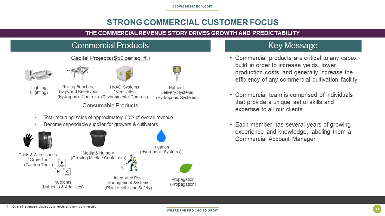 WHERE THE PROS GO TO GROW growgeneration.com 13 Commercial Products Capital Projects ($50 per sq. ft.) Consumable Products • Total recurring sales of approximately 60% of overall revenue 1 • Become dependable supplier for growers & cultivators Lighting (Lighting) Rolling Benches, Trays and Reservoirs (Hydroponic Controls) Nutrient Delivery Systems (Hydroponic Systems) HVAC Systems / Ventilation (Environmental Controls) Integrated Pest Management Systems (Plant Health and Safety) Media & Nursery (Growing Media / Containers) Propagation (Propagation) Tools & Accessories / Grow Tent (Garden Tools) Irrigation (Hydroponic Systems) Nutrients (Nutrients & Additives) • Commercial products are critical to any capex build in order to increase yields, lower production costs, and generally increase the efficiency of any commercial cultivation facility • Commercial team is comprised of individuals that provide a unique set of skills and expertise to all our clients • Each member has several years of growing experience and knowledge, labeling them a Commercial Account Manager Key Message STRONG COMMERCIAL CUSTOMER FOCUS THE COMMERCIAL REVENUE STORY DRIVES GROWTH AND PREDICTABILITY 1) Overall revenue includes commercial and non - commercial.