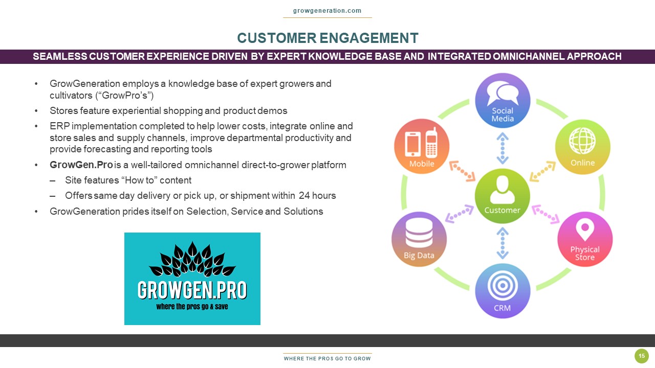WHERE THE PROS GO TO GROW growgeneration.com 14 • The private label program, under the Sunleaves brand, began to be stocked on shelves and online in Q4 2019 • Initial private label lineup includes a one - part micro and macro nutrient+ Cal mag powder line, for both cannabis and hemp farmers, a silica+ micronutrient booster and a root stimulant • Private label products represented 2% of revenue in 2019 • Products have a higher gross margin profile • Additives work in combination with all major brand name nutrient systems BIG OPPORTUNITY IN PRIVATE LABEL PRODUCTS