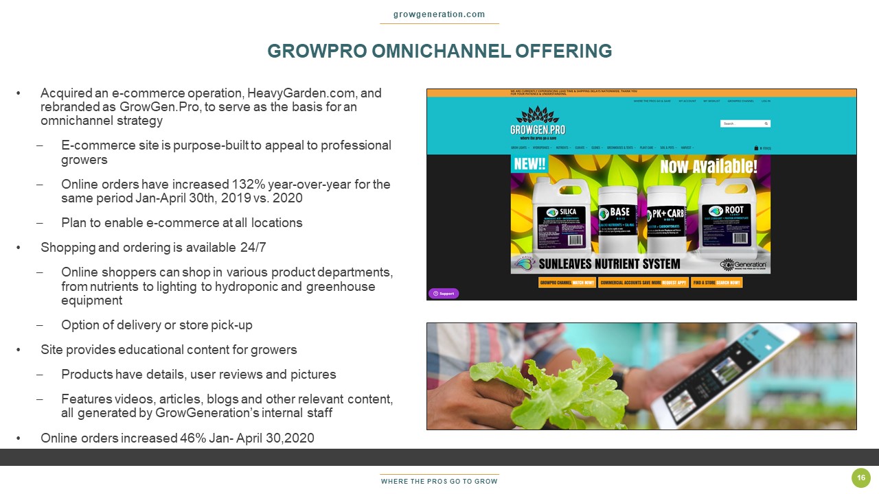WHERE THE PROS GO TO GROW growgeneration.com 15 • GrowGeneration employs a knowledge base of expert growers and cultivators (“GrowPro’s”) • Stores feature experiential shopping and product demos • ERP implementation completed to help lower costs, integrate online and store sales and supply channels, improve departmental productivity and provide forecasting and reporting tools • GrowGen.Pro is a well - tailored omnichannel direct - to - grower platform – Site features “How to” content – Offers same day delivery or pick up, or shipment within 24 hours • GrowGeneration prides itself on Selection, Service and Solutions CUSTOMER ENGAGEMENT SEAMLESS CUSTOMER EXPERIENCE DRIVEN BY EXPERT KNOWLEDGE BASE AND INTEGRATED OMNICHANNEL APPROACH