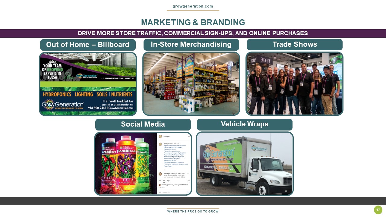WHERE THE PROS GO TO GROW growgeneration.com 16 • Acquired an e - commerce operation, HeavyGarden.com, and rebranded as GrowGen.Pro, to serve as the basis for an omnichannel strategy – E - commerce site is purpose - built to appeal to professional growers – Online orders have increased 132% year - over - year for the same period Jan - April 30th, 2019 vs. 2020 – Plan to enable e - commerce at all locations • Shopping and ordering is available 24/7 – Online shoppers can shop in various product departments, from nutrients to lighting to hydroponic and greenhouse equipment – Option of delivery or store pick - up • Site provides educational content for growers – Products have details, user reviews and pictures – Features videos, articles, blogs and other relevant content, all generated by GrowGeneration’s internal staff • Online orders increased 46% Jan - April 30,2020 GROWPRO OMNICHANNEL OFFERING
