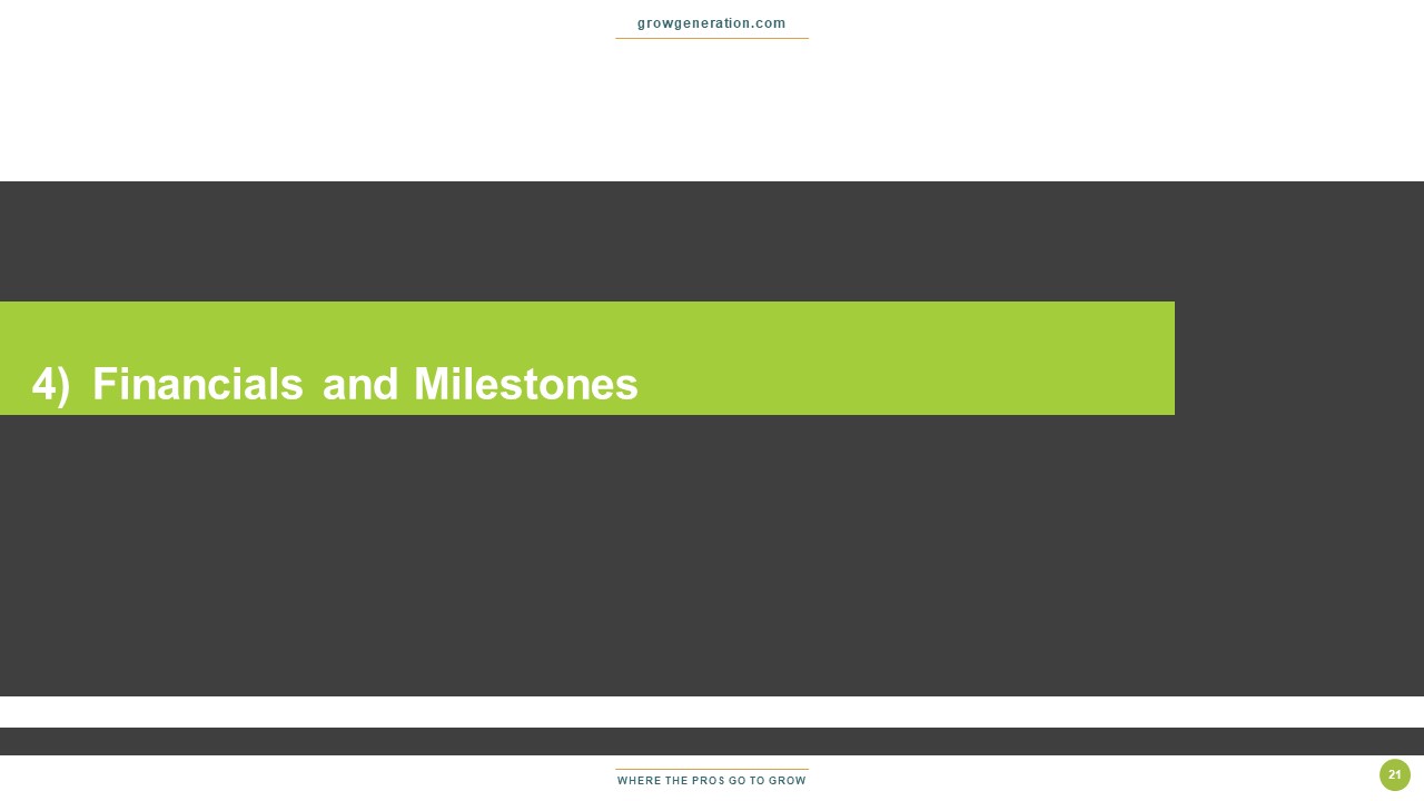 WHERE THE PROS GO TO GROW growgeneration.com 21 4) Financials and Milestones