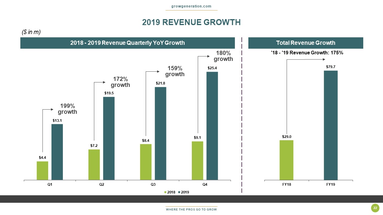 WHERE THE PROS GO TO GROW growgeneration.com 27 Projected Revenue Estimated Adjusted EBITDA 4 - Wall Economics and Adjusted EBITDA $14 $29 $80 $130 $181 2017 2018 2019 2020E 2021E $6.6 $13.5 $22.0 2019 2020E 2021E 29% 12% 17% 8% 9% 30% 12% 18% 7% 11% Gross Profit Operating Expenses Operating Income G&A Adjusted EBITDA 2019 2020E 2019 Revenue $80M +$51 million or 175% vs 2018 Q4 2019 Revenue $25M +$16 million vs Q4 2018 Same Store Sales +62% Q4 2019 vs Q4 2018 Same Store Sales +36% 2019 vs 2018 10 New & Acquired Store Locations in 2019 ($ in m) Dec-18 Dec-19 Sales $29.0 $79.7 Cost of Goods Sold 22.6 57.2 Gross Profit $6.4 $22.6 Operating Expenses Store Operations 5.2 10.1 General and Administrative 1.6 3.2 Share Based Compensation 1.9 2.5 Depreciation and Amortization 0.4 1.0 Salaries and Related Expenses 1.6 3.6 Total Operating Expenses $10.7 $20.4 Operating Income (Loss) ($4.3) $2.1 Other Income (Expense) Miscellaneous Income (Expense) 0.1 (0.0) Interest Income 0.1 0.1 Interest Expense (0.0) (0.0) Amortization of Debt Discount (1.0) (0.4) Total Other Income (Expense) ($0.8) ($0.3) Net Income (Loss) ($5.1) $1.9 FINANCIAL HIGHLIGHTS