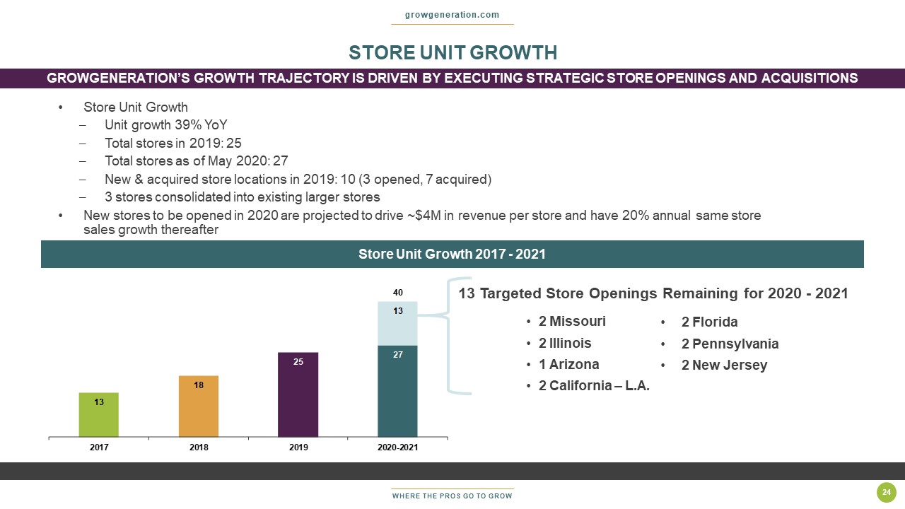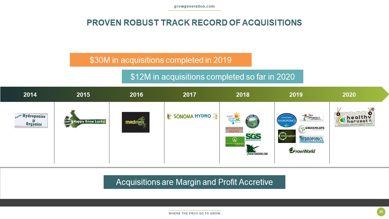 WHERE THE PROS GO TO GROW growgeneration.com 24 • Store Unit Growth – Unit growth 39% YoY – Total stores in 2019: 25 – Total stores as of May 2020: 27 – New & acquired store locations in 2019: 10 (3 opened, 7 acquired) – 3 stores consolidated into existing larger stores • New stores to be opened in 2020 are projected to drive ~$4M in revenue per store and have 20% annual same store sales growth thereafter Store Unit Growth 2017 - 2021 13 18 25 27 13 40 2017 2018 2019 2020-2021 13 Targeted Store Openings Remaining for 2020 - 2021 • 2 Florida • 2 Pennsylvania • 2 New Jersey • 2 Missouri • 2 Illinois • 1 Arizona • 2 California – L.A. STORE UNIT GROWTH GROWGENERATION’S GROWTH TRAJECTORY IS DRIVEN BY EXECUTING STRATE GIC STORE OPENINGS AND ACQUISITIONS