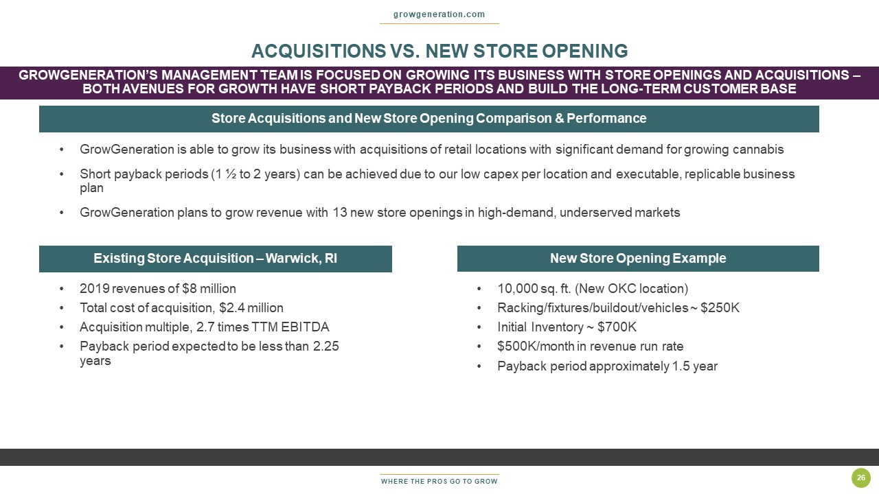 WHERE THE PROS GO TO GROW PROVEN ROBUST TRACK RECORD OF ACQUISITIONS growgeneration.com 2014 2015 2016 2017 2018 2019 2020 $30M in acquisitions completed in 2019 $12M in acquisitions completed so far in 2020 Acquisitions are Margin and Profit Accretive 25