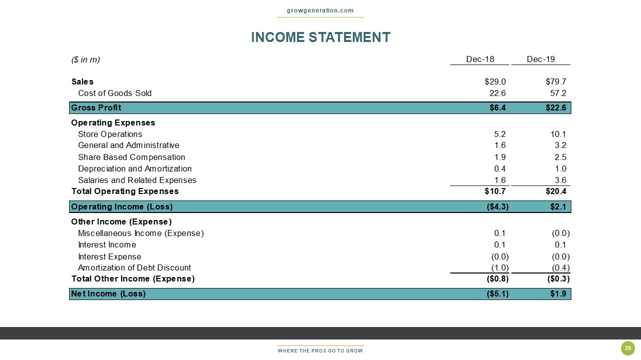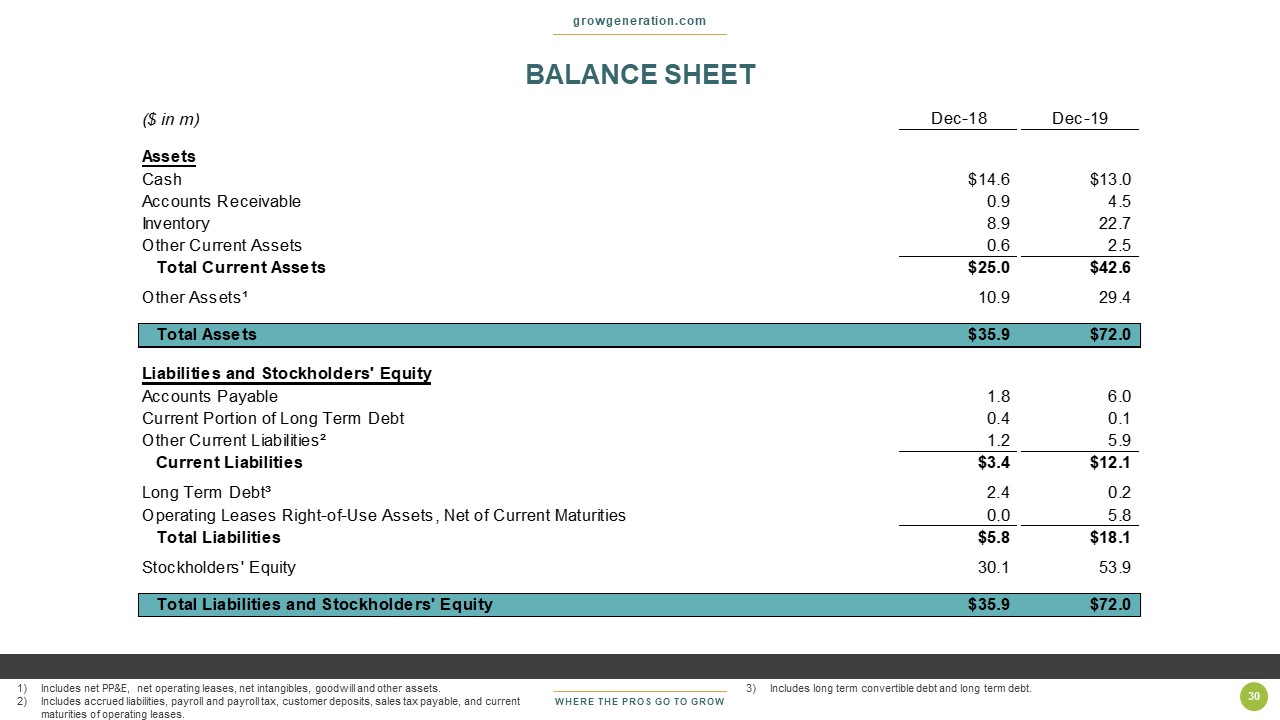 WHERE THE PROS GO TO GROW growgeneration.com 29 INCOME STATEMENT ($ in m) Dec-18 Dec-19 Sales $29.0 $79.7 Cost of Goods Sold 22.6 57.2 Gross Profit $6.4 $22.6 Operating Expenses Store Operations 5.2 10.1 General and Administrative 1.6 3.2 Share Based Compensation 1.9 2.5 Depreciation and Amortization 0.4 1.0 Salaries and Related Expenses 1.6 3.6 Total Operating Expenses $10.7 $20.4 Operating Income (Loss) ($4.3) $2.1 Other Income (Expense) Miscellaneous Income (Expense) 0.1 (0.0) Interest Income 0.1 0.1 Interest Expense (0.0) (0.0) Amortization of Debt Discount (1.0) (0.4) Total Other Income (Expense) ($0.8) ($0.3) Net Income (Loss) ($5.1) $1.9
