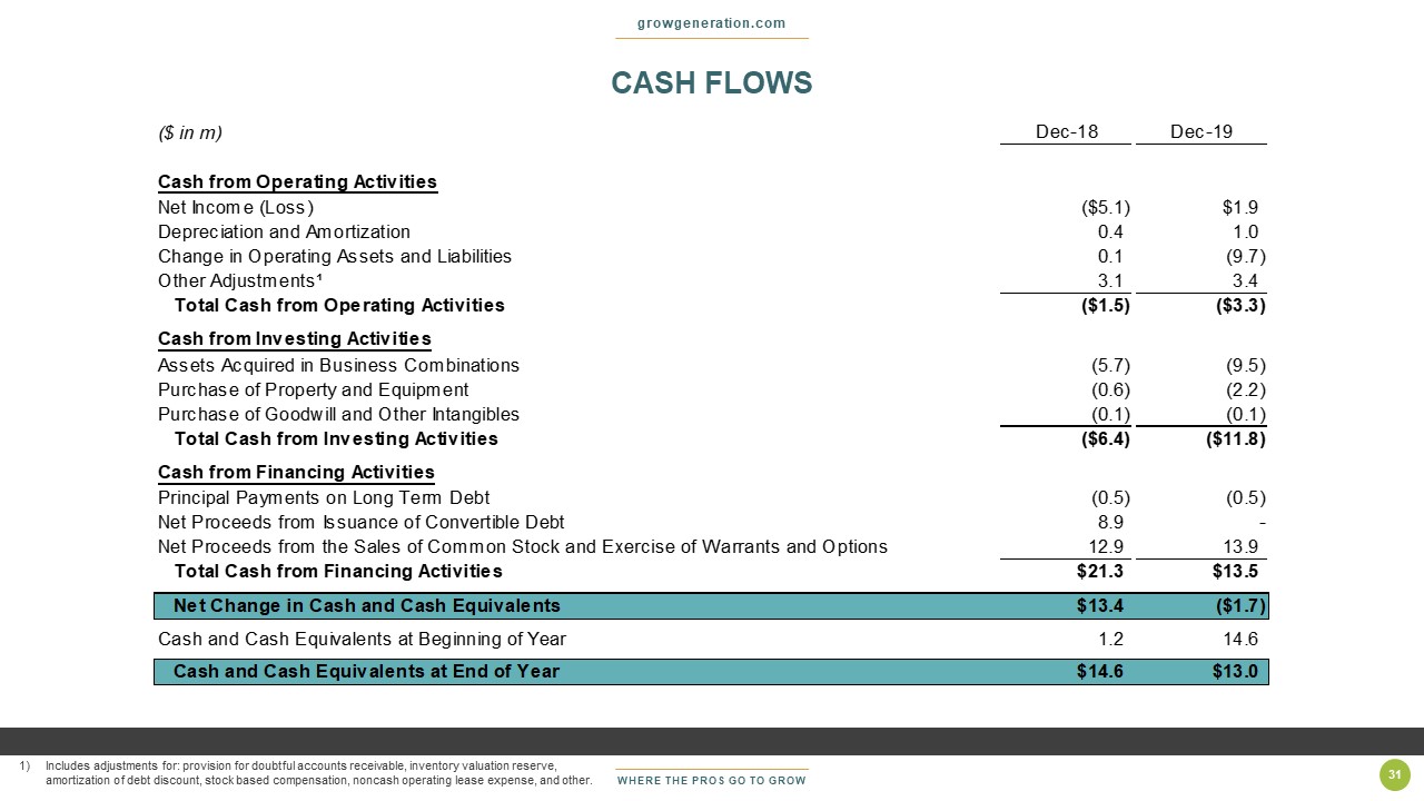 WHERE THE PROS GO TO GROW growgeneration.com 30 1) Includes net PP&E, net operating leases, net intangibles, goodwill and other assets. 2) Includes accrued liabilities, payroll and payroll tax, customer deposits, sales tax payable, and current maturities of operating leases. BALANCE SHEET ($ in m) Dec-18 Dec-19 Assets Cash $14.6 $13.0 Accounts Receivable 0.9 4.5 Inventory 8.9 22.7 Other Current Assets 0.6 2.5 Total Current Assets $25.0 $42.6 Other Assets¹ 10.9 29.4 Total Assets $35.9 $72.0 Liabilities and Stockholders' Equity Accounts Payable 1.8 6.0 Current Portion of Long Term Debt 0.4 0.1 Other Current Liabilities² 1.2 5.9 Current Liabilities $3.4 $12.1 Long Term Debt³ 2.4 0.2 Operating Leases Right-of-Use Assets, Net of Current Maturities 0.0 5.8 Total Liabilities $5.8 $18.1 Stockholders' Equity 30.1 53.9 Total Liabilities and Stockholders' Equity $35.9 $72.0 3) Includes long term convertible debt and long term debt.