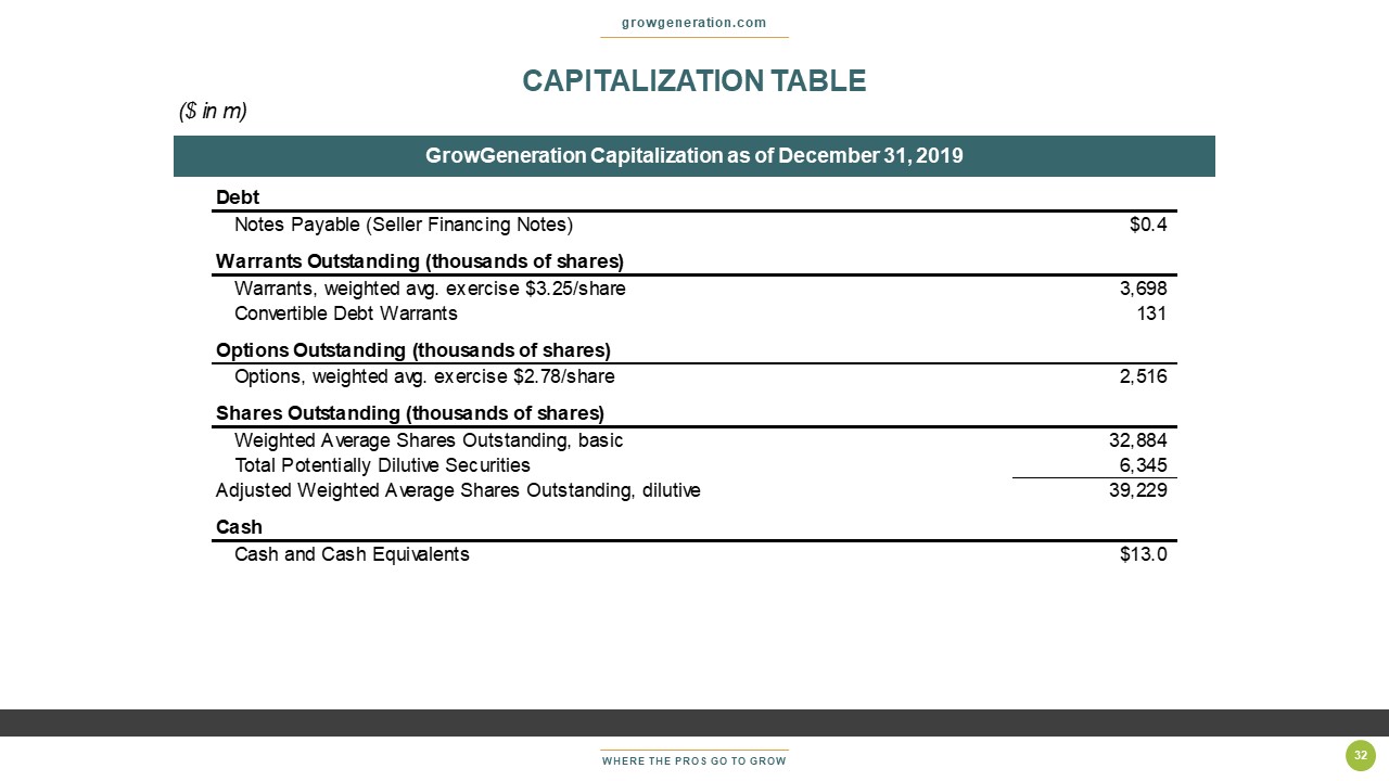 WHERE THE PROS GO TO GROW CASH FLOWS growgeneration.com 31 ($ in m) Dec-18 Dec-19 Cash from Operating Activities Net Income (Loss) ($5.1) $1.9 Depreciation and Amortization 0.4 1.0 Change in Operating Assets and Liabilities 0.1 (9.7) Other Adjustments¹ 3.1 3.4 Total Cash from Operating Activities ($1.5) ($3.3) Cash from Investing Activities Assets Acquired in Business Combinations (5.7) (9.5) Purchase of Property and Equipment (0.6) (2.2) Purchase of Goodwill and Other Intangibles (0.1) (0.1) Total Cash from Investing Activities ($6.4) ($11.8) Cash from Financing Activities Principal Payments on Long Term Debt (0.5) (0.5) Net Proceeds from Issuance of Convertible Debt 8.9 - Net Proceeds from the Sales of Common Stock and Exercise of Warrants and Options 12.9 13.9 Total Cash from Financing Activities $21.3 $13.5 Net Change in Cash and Cash Equivalents $13.4 ($1.7) Cash and Cash Equivalents at Beginning of Year 1.2 14.6 Cash and Cash Equivalents at End of Year $14.6 $13.0 1) Includes adjustments for: provision for doubtful accounts receivable, inventory valuation reserve, amortization of debt discount, stock based compensation, noncash operating lease expense, and other.