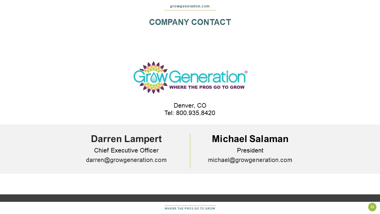 WHERE THE PROS GO TO GROW COMPANY CONTACT growgeneration.com Contacts Michael Salaman President michael@growgeneration.com Darren Lampert Chief Executive Officer darren@growgeneration.com Denver, CO Tel: 800.935.8420 33