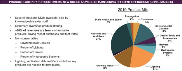 We sell a variety of products, including nutrients, growing media, advanced indoor and greenhouse lighting, ventilation systems, and accessories for hydroponic gardening, as well as other indoor and outdoor growing products. Our supply chain includes several thousand stock keeping units (“SKUs”) across 12 product departments. Many of our products are consumables leading to repeat orders by our customers. Consumable products are mainly nutrients and additives that feed the plants on a recurring basis. Our strategy is to supply products to two groups of customers: commercial growers and smaller growers that require a local center to fulfill their daily and weekly growing needs.